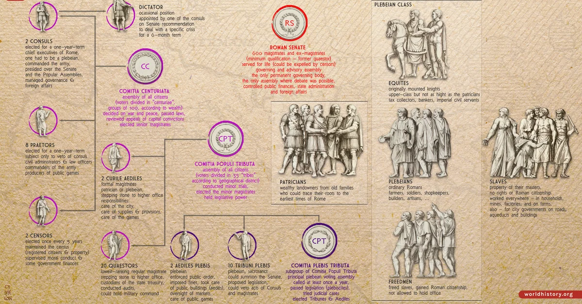 A pesar de sus numerosas características democráticas, la constitución romana no era verdaderamente democrática, ya que la República romana sustituyó el gobierno de un monarca único por el gobierno de la élite, los patricios.