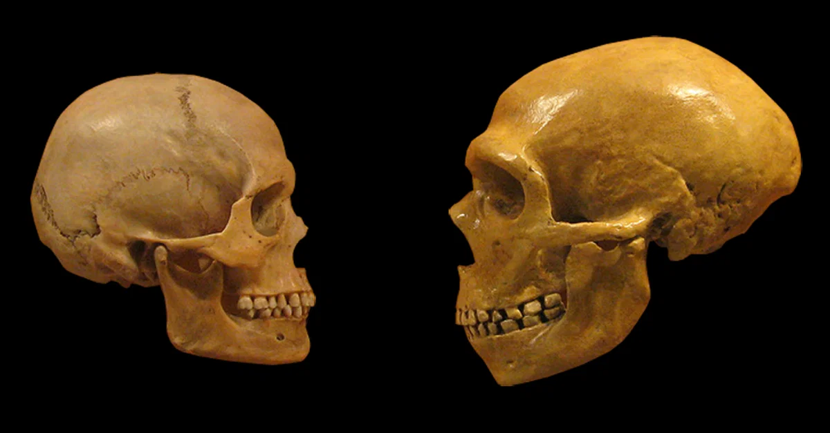 Cuando estos dos grupos hicieron contacto personal, ya existían algunas diferencias. Los neandertales eran de constitución robusta, de cráneos grandes con arcos superciliares, y carecían de un verdadero mentón, mientras los esqueletos de los humanos modernos eran delgados y altos, con cabezas de perfilada barbilla y caras retraídas bajo el cráneo. Sin embargo, ambos cazaban y recolectaban, empleaban herramientas bien fabricadas para sobrevivir, y muestran indicios de haber empleado el fuego y de realizar enterramientos.
