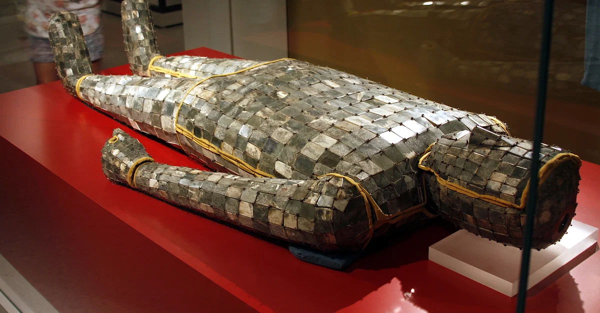 Una forma de arte única e impresionante fue la creación de «trajes» de jade para cubrir los cuerpos de los difuntos en las tumbas reales. Estos «trajes» siguen los contornos del cuerpo y están compuestos de hasta 2.000 piezas rectangulares de jade talladas individualmente y cosidas con hilo de oro o plata. Dos ejemplos de esto son la tumba del príncipe Liu Sheng y la princesa Dou Wan de Mancheng de finales del siglo II a.C. Reservados exclusivamente para la realeza, la producción de los trajes llegó a ser tan costosa que los gobernantes posteriores prohibieron su uso.