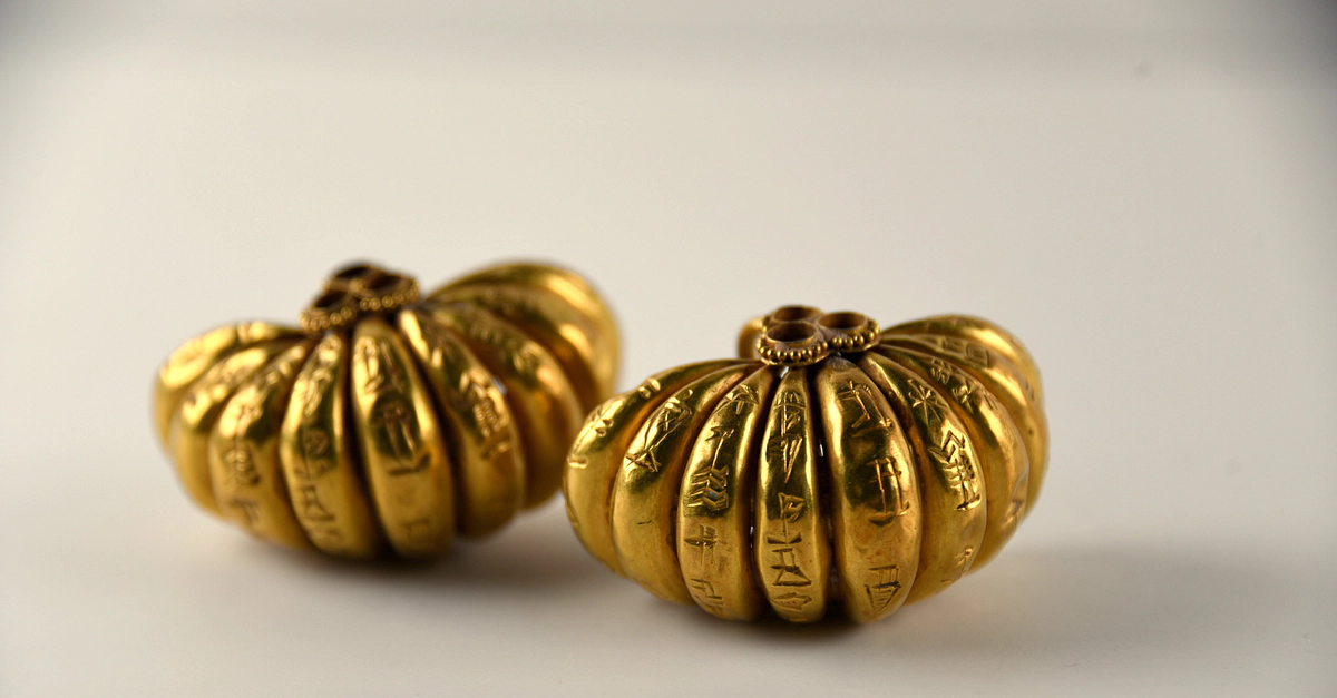 Por lo tanto, estos pendientes tienen 4000 años. Se desconoce la procedencia precisa y la fecha de la excavación. Parecen haber sido desenterrados en algún lugar del sur de Mesopotamia (actual sur de Irak). No llevan número de registro de ningún museo. No está claro si fueron excavados antes o después de la invasión de Irak encabezada por Estados Unidos en 2003. Cuando los adquirió el Museo Sulaymaniyah, los aretes estaban en un estado de conservación casi perfecto. Esto es algo muy extraño para un antiguo par mesopotámico de aretes relativamente grandes de oro casi puro; no estaban muy deformados. Además, la forma y las tallas de los pendientes son algo inusuales si los comparamos con los pendientes mesopotámicos que datan del mismo período. De hecho, en un primer momento se cuestionó la autenticidad de los pendientes.
