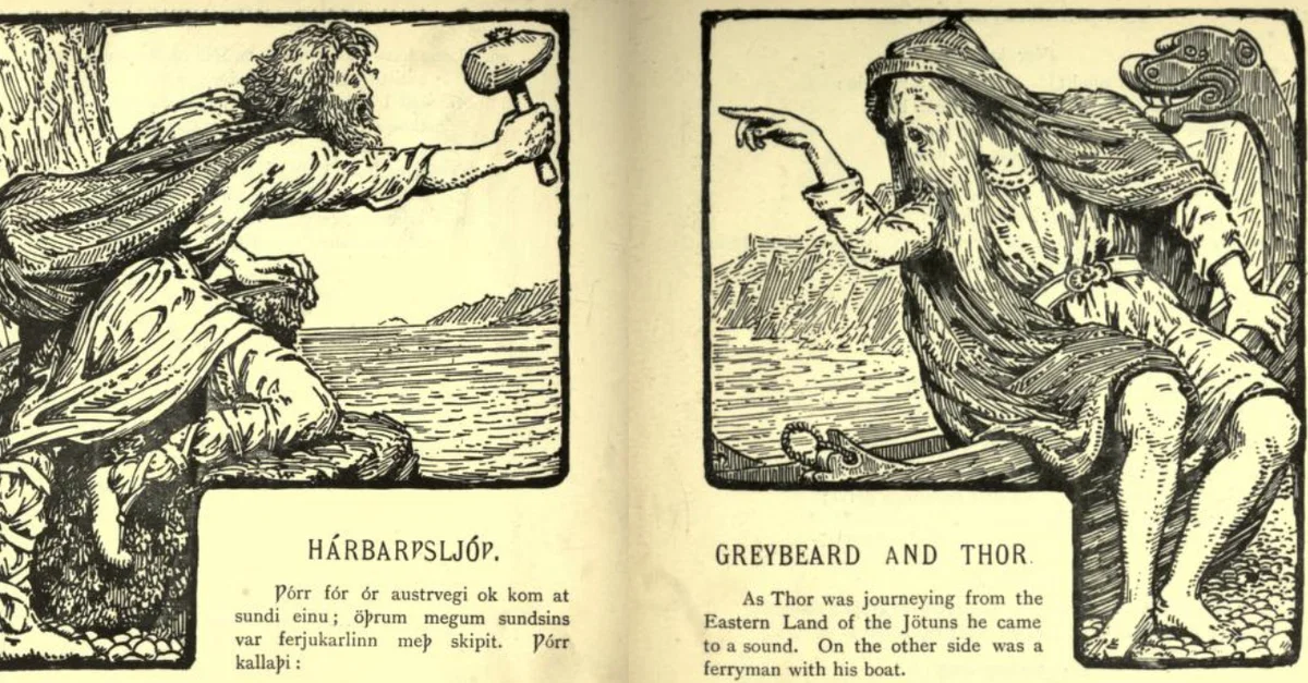 En la historia, Thor regresa de lo que podría haber sido un viaje importante, probablemente un encuentro con un gigante, y pide que le den transporte a cambio de comida, pero el barquero no solo se niega, sino que también le dice que su madre (Jorð, la tierra) ha muerto y continúa menospreciándolo, afirmando que ni siquiera tiene graneros ni ropa adecuada, por lo que no es un campesino digno, el cual era un rol esencial en la Edad Media. Odín dice que se le asignó la tarea de transportar solo a hombres dignos, y Thor aparentemente no lo es. Thor, en un acto de valentía, ya que aún se encontraba en territorio enemigo, revela su identidad como «el más fuerte entre los dioses» (Hildebrand, 173), mientras que Odín miente y le da su otro nombre, Harbard (Hárbarþr), y presume de que rara vez ocultaría su nombre. La mayor mentira, sin duda. Continúa con el insulto y dice que se escondería y se defendería de personas como Thor.