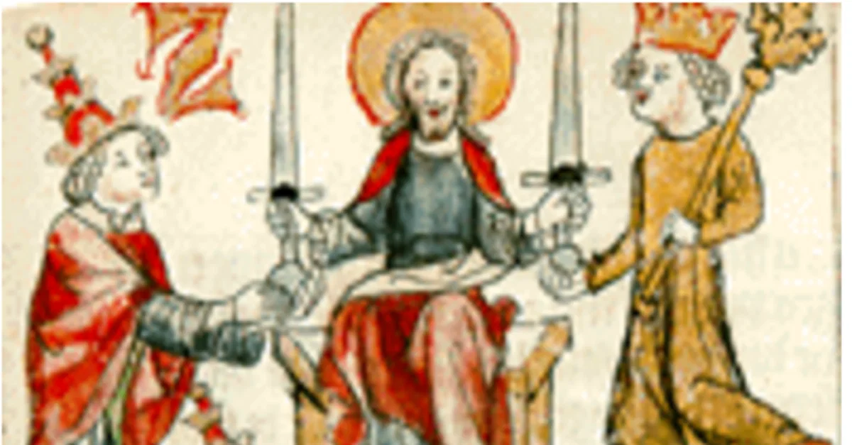 Esa imagen de las dos espadas, papa y emperador, como mandatarios representativos de la cristiandad latina, era una interpretación discutible de un pasaje del evangelio de Lucas: “Los discípulos dijeron, ‘Mirad, Señor, aquí hay dos espadas.’ Es suficiente, respondió” (22, 37-38). Si estaba basada en unos fundamentos bíblicos inestables, pronto quebraron también los fundamentos políticos, y las dos espadas empezaron a chocar entre ellas.