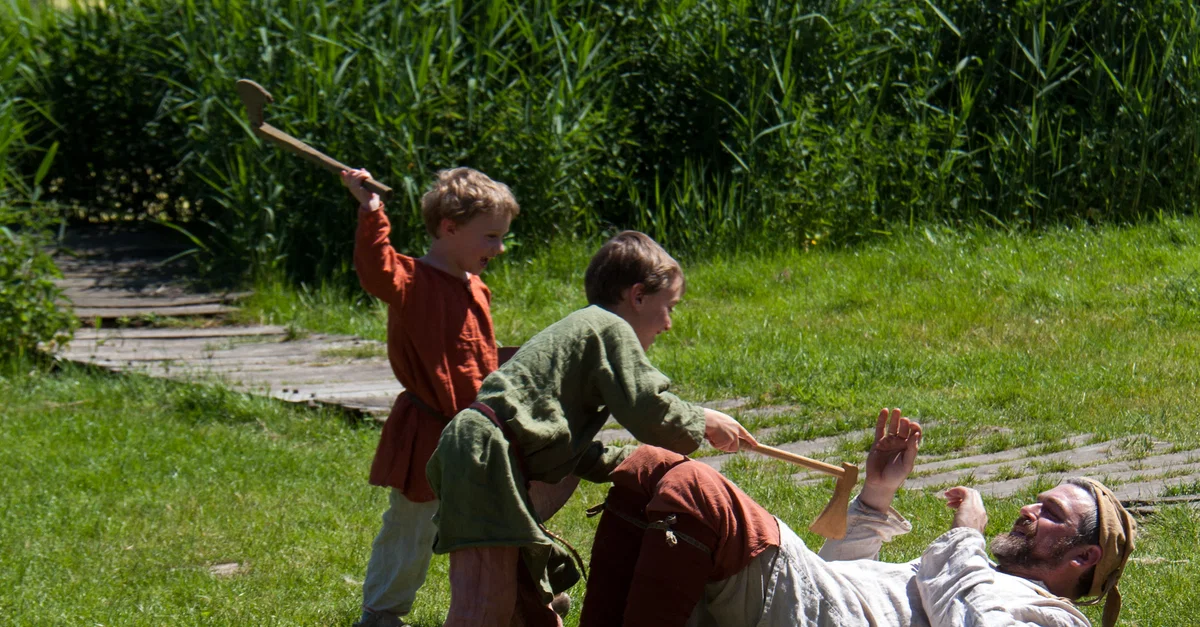 De los niños no sólo se esperaba que trabajaran, sino también que mantuvieran el honor familiar, lo que podía incluir su participación en conflictos violentos. Como la venganza era un concepto central en la sociedad vikinga, los niños se involucraban en luchas sangrientas a edades sorprendentemente tempranas. En la sagaGísla, Helgi (de 12 años) y Bergr (de 11) vengaron la muerte de su padre, lo que demuestra que la expectativa de tomar las armas podía comenzar mucho antes de la edad adulta. Incluso el juego podía volverse violento. En la saga Egil Skallagrímson, el precoz Egill Skallagrímsson, de siete años, participa en una reunión local (llamada leikir), en la que los niños participan en simulacros de combate similares a los juegos adultos. Se enfrenta a un niño mayor y más fuerte, y pierde. Furioso por la derrota, Egill golpea primero a su oponente con un palo y, cuando se siente aún más humillado, busca a un amigo mayor que le entrega un hacha. Sin dudarlo, Egill mata al chico. Esta reacción extrema provocaría una pelea en toda regla entre los adultos, con el resultado de la muerte de siete hombres. La historia ejemplifica cómo las peleas infantiles podían convertirse en graves conflictos y cómo, desde pequeños, se esperaba que los niños reaccionaran con decisión y violencia ante los desaires personales.