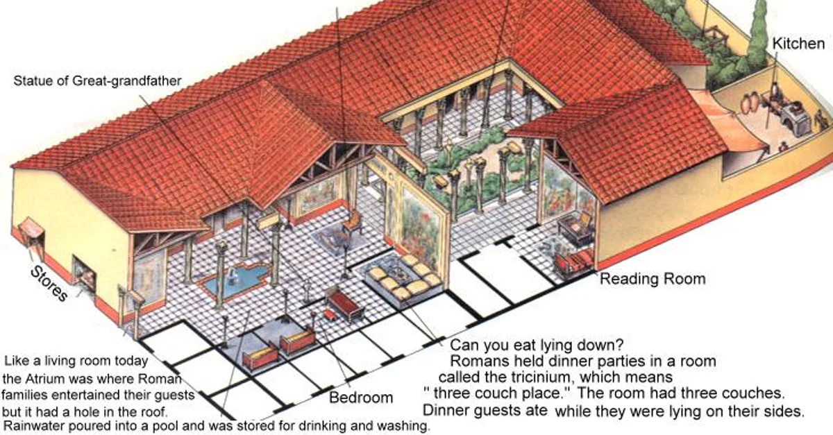 Atrium: El atrio era el salón central, mas o menos equivalente al moderno vestíbulo, y era la habitación más llamativa en una domus romana. Tenía el techo abierto, lo cual permitía la entrada de luz y aire, y también permitía recolectar al agua de lluvia, para beber y lavar, en el impluvium, un pequeño estanque de drenaje en el centro del atrio. También había cisternas por toda la domus para recolectar el agua de lluvia, que actuaban como suministro principal de agua ante la ausencia de agua corriente.