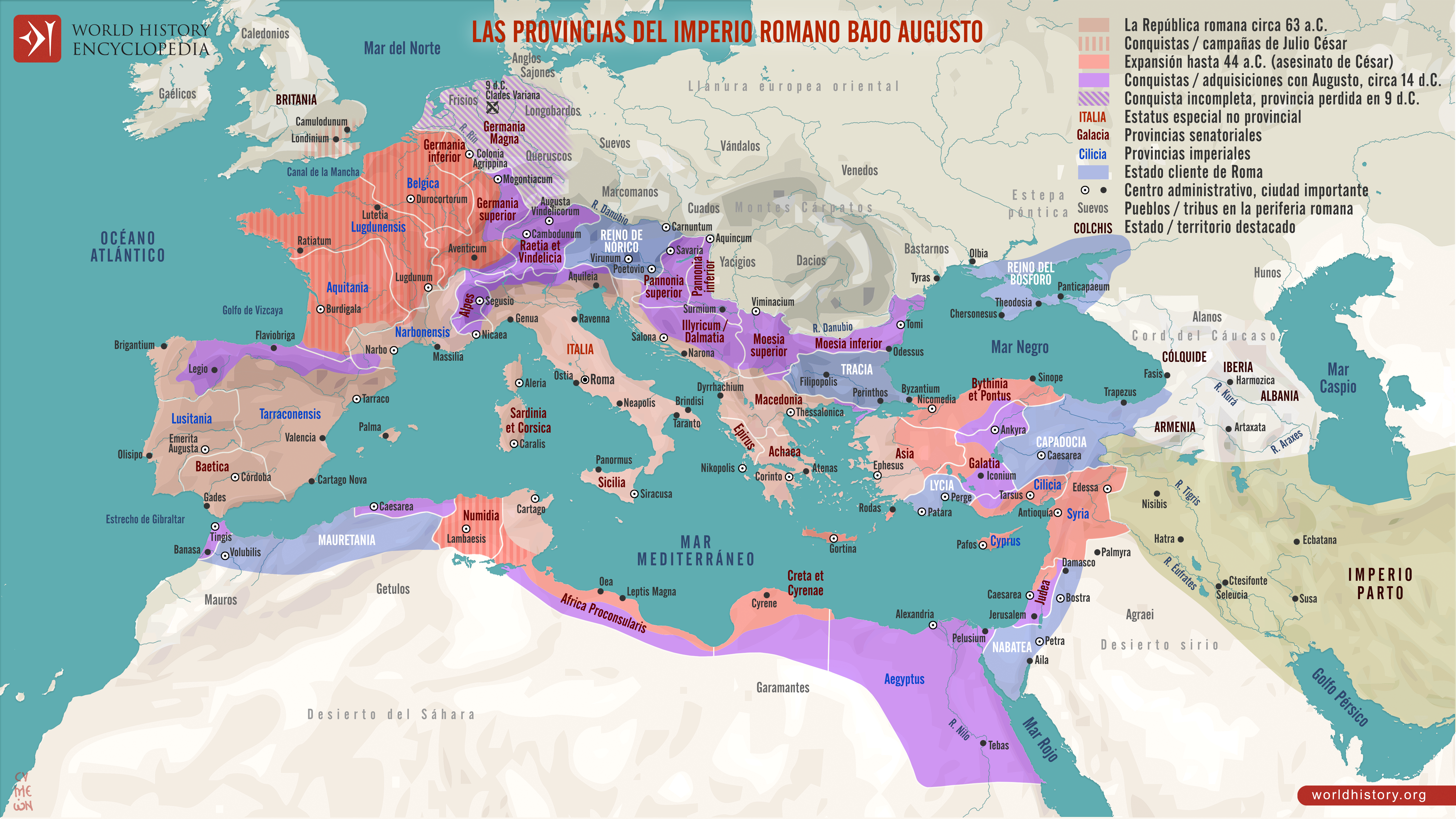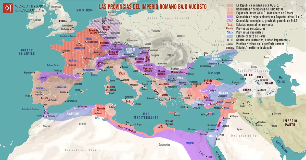 Este mapa ilustra la expansión de la República romana durante las campañas militares y las conquistas de Julio César (100–44 a.C.) y su transformación en imperio bajo el reinado de César Augusto (63 a.C.–14 d.C.), también conocido como Octaviano. Para cuando Augusto se murió en 14 d.C., el mundo romano abarcaba todo el Mediterráneo y se extendía desde el mar del Norte hasta el mar Rojo.