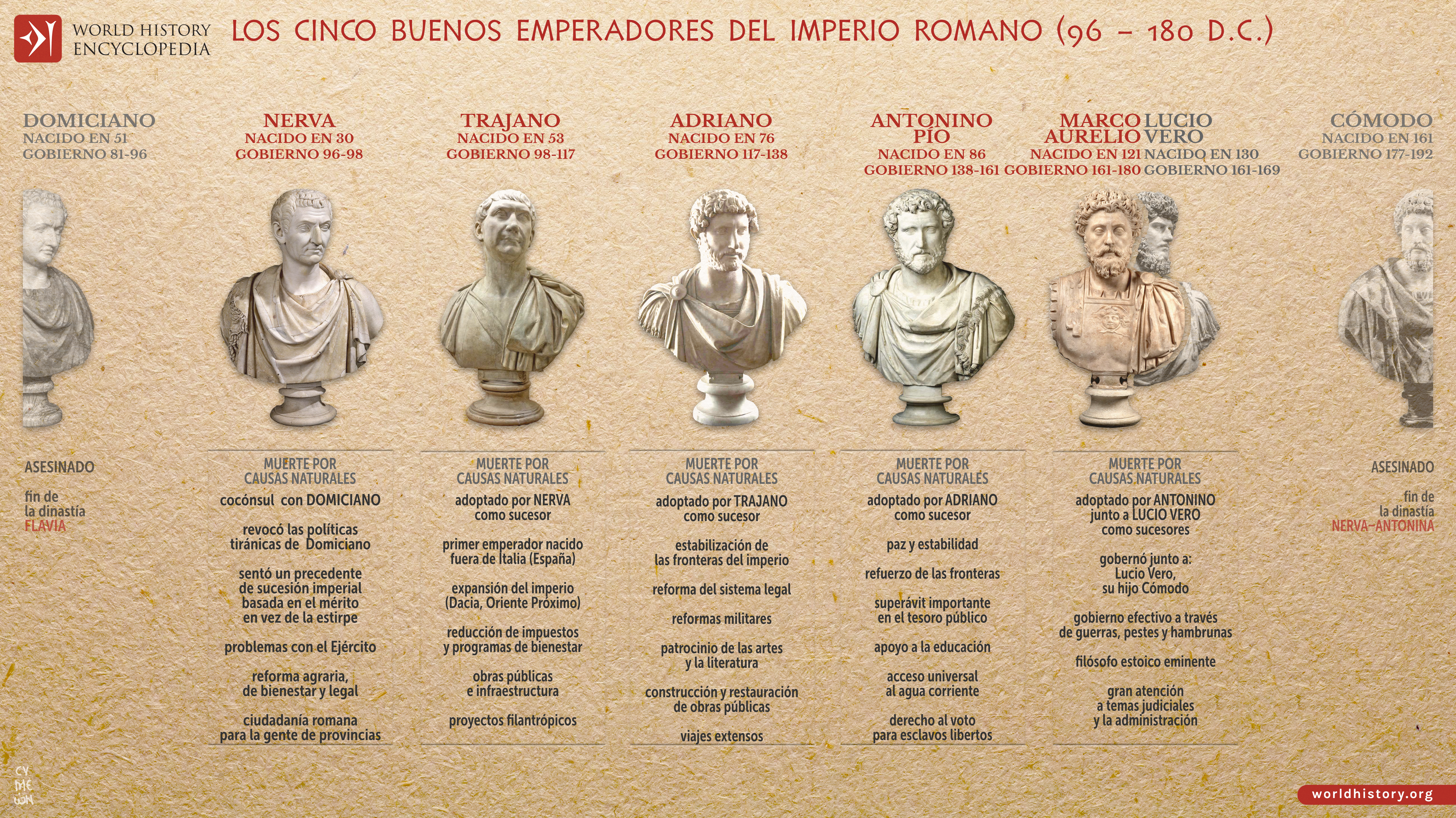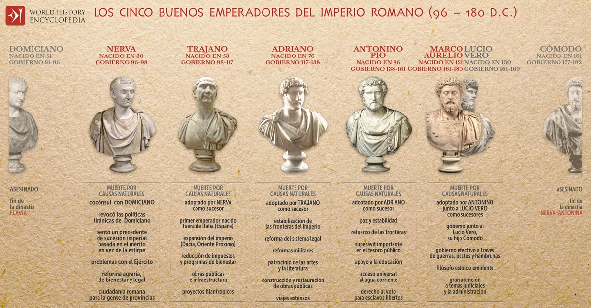 Esta infografía ilustra la sucesión de los emperadores romanos entre 96 y 180 d.C., que se suelen conocer como los cinco emperadores buenos: Nerva, Trajano, Adriano, Antonino Pío y Marco Aurelio. Este término, que los propios romanos no utilizaban, fue acuñado por Nicolás Maquiavelo en su manuscrito de 1531 Discursos sobre Livio y más tarde fue popularizado por Edward Gibbon en La historia de la decadencia y la caída del Imperio romano. En general, este periodo de 84 años se considera la edad dorada del gobierno romano, una época marcada por la estabilidad interna, la eficiencia de la administración y una sucesión de poder relativamente pacífica basada en el mérito y la adopción en vez de la descendencia.
