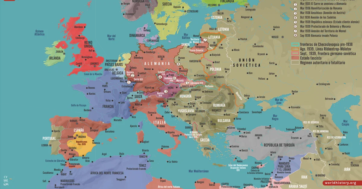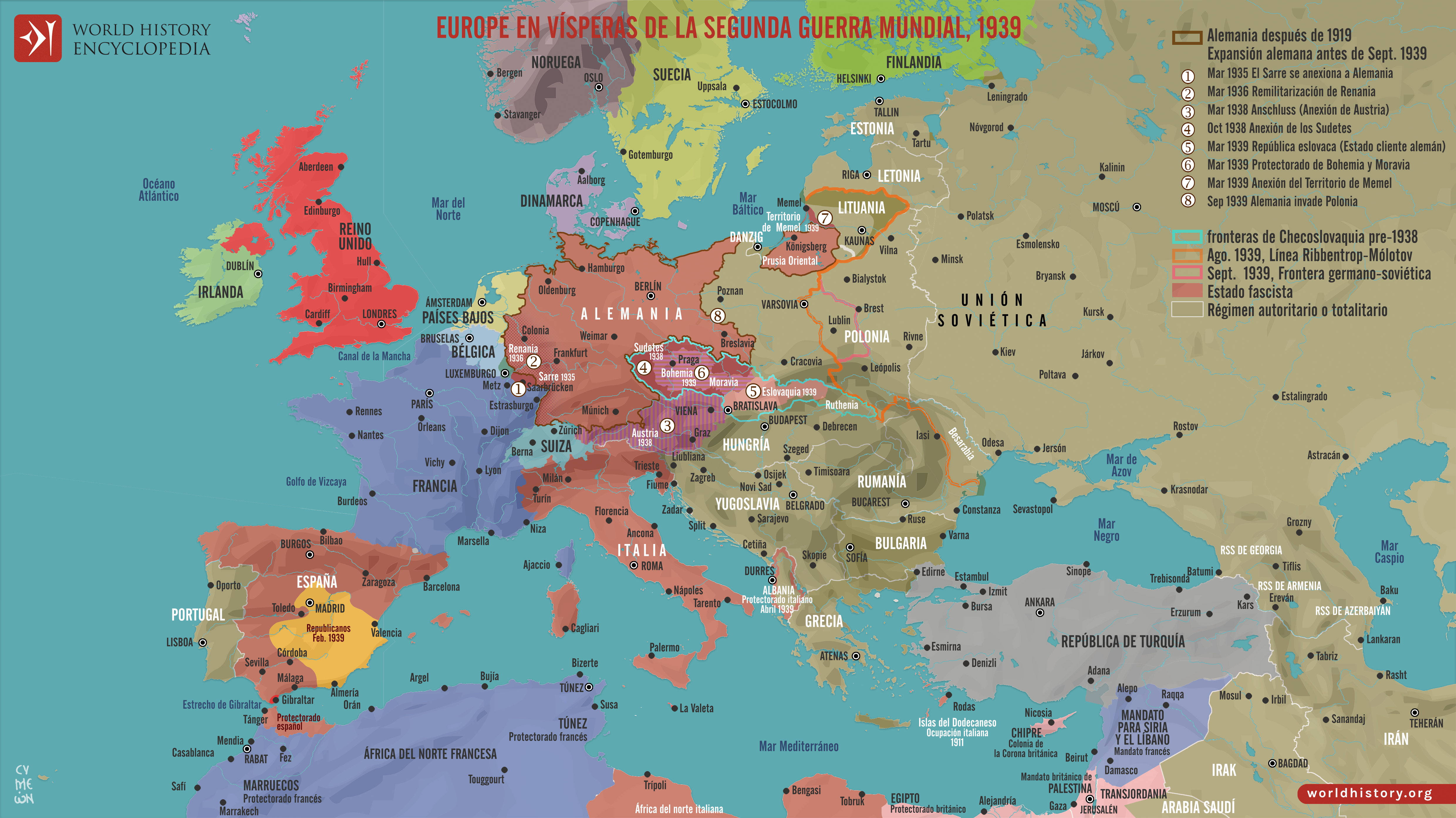Mapa que ilustra la creciente inestabilidad en Europa en el periodo previo a la Segunda Guerra Mundial y captura la agresiva expansión territorial de la Alemania nazi y el fracaso de la política de apaciguamiento. Entre 1935 y 1939, Adolf Hitler llevó a cabo una serie de audaces movimientos geopolíticos que remodelaron el panorama europeo y sentaron las bases para un conflicto mundial.