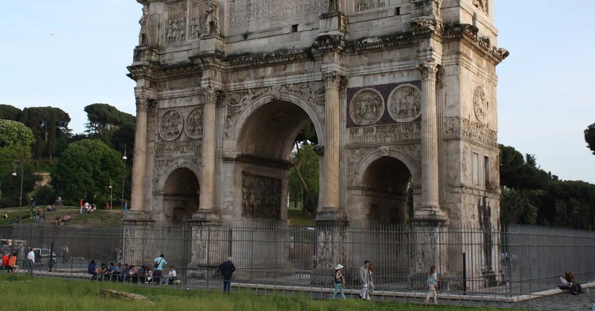 Le plus grand exemple conservé d'arc de triomphe est l'arc de Constantin, construit à Rome vers 315 de notre ère pour commémorer la victoire de l'empereur Constantin sur Maxence en 312. L'arc est typique du genre et présente un énorme bloc rectangulaire de maçonnerie de 20 mètres de haut composé de trois arcs distincts : un grand passage central en arc et un arc plus court et plus étroit de chaque côté. Les trois arcs expriment le même rapport de hauteur et de largeur. Les arcs sont séparés par quatre colonnes corinthiennes détachées, chacune reposant sur un piédestal et surmontée d'un entablement. Au-dessus de l'entablement, dans le prolongement des colonnes, se trouvent quatre piédestaux portant chacun une statue. Le bloc ou étage "mansardé" au-dessus des arcs présente également des panneaux sculptés et une inscription dédicatoire en latin, une caractéristique commune des arcs de triomphe. Certaines parties de la sculpture ont été recyclées de monuments antérieurs, notamment les panneaux de l'attique qui proviennent de l'arc de Marc-Aurèle (vers 174 de notre ère) et les reliefs de l'arc central intérieur qui furent retirés de la basilique Ulpia du Forum de Trajan. Les huit statues sont des prisonniers daces et proviennent probablement de l'arc de Domitien. D'autres panneaux représentent une chasse au lion et des sacrifices, tandis que les scènes de la frise principale commémorent les victoires militaires de Constantin, notamment la bataille contre Maxence.