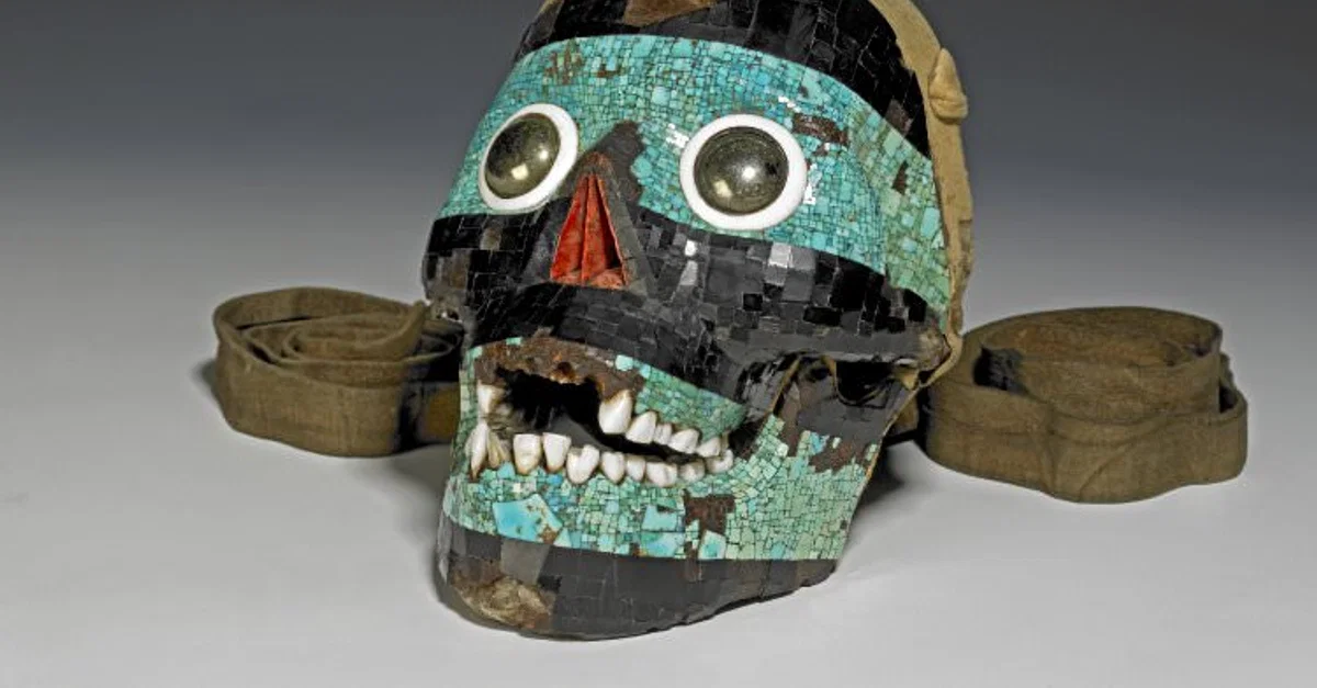 Tezcatlipoca est souvent représenté portant un masque turquoise avec un bandeau noir pour les yeux. L'un des objets d'art les plus célèbres du dieu est d'ailleurs le crâne décoré qui se trouve aujourd'hui au British Museum de Londres. Le crâne est recouvert d'une mosaïque de lignite turquoise et noire, avec une coquille d'huître rouge épineuse dans la cavité nasale. La pyrite polie entourée de conques blanches forme les yeux. L'intérieur du masque est doublé de peau de cervidé et le même matériau est utilisé pour les deux sangles attachées au crâne. Cet objet remarquable pourrait bien être l'un des cadeaux que le roi aztèque Montezuma II offrit à Hernando Cortés en 1519.