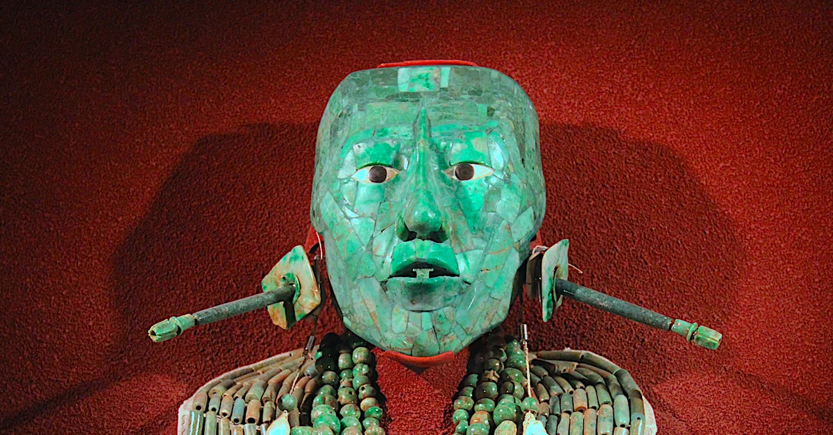 La dalle de pierre était le sarcophage de Pacal qui, lorsqu'on le déplaça, révéla le grand roi portant un masque de jade et paré comme le dieu maya du maïs de bijoux en jade et d'une jupe en filet perlé. L'historien Clare Gibson commente cet écrit,