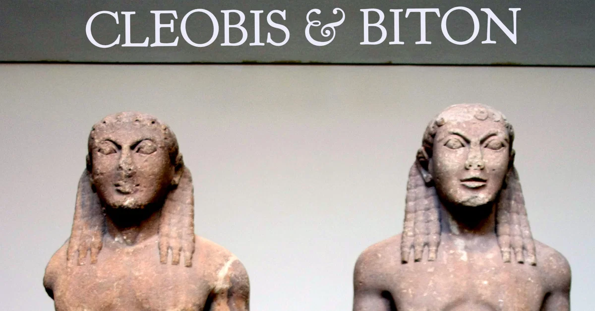 Le mythe de Cléobis et Biton est raconté dans Hérodote, 1.31. Les deux fils transportaient leur mère, prêtresse, dans une charrette à la place des bœufs. Ils voyagèrent d'Argos à l'Héraion d'Argos, soit environ 45 stades.