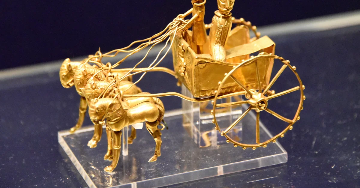 Il y a deux maquettes de chars, toutes deux en or, dont l'une est incomplète. Les chars sont tirés par des chevaux minutieusement modelés et le chariot contient deux personnages - un conducteur et un passager - tous deux représentés en détail, jusqu'à l'expression de leur visage. La posture et la démarche des chevaux sont également détaillées. L'attelage est orné d'une image du dieu égyptien de la fertilité, Bès, sur le devant et de motifs sur les deux côtés, tandis que les roues sont à rayons et perlées le long des jantes. Les rênes tenues par le conducteur semblent créer l'illusion du mouvement.