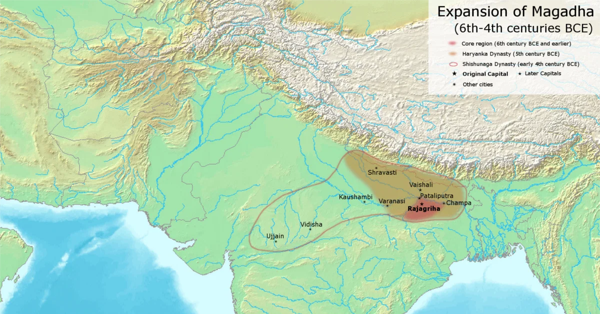 À l'époque où Gautama Siddhartha devint le Bouddha, le Magadha était un royaume florissant sous le règne de son roi Bimbisâra. Sous Bimbisâra, le Magadha annexa les royaumes voisins de l'est et fit des alliances matrimoniales avec ceux de l'ouest et du nord. Il était ami avec un autre voisin, Avanti, auprès duquel il envoya son propre médecin lorsque le roi d'Avanti était malade. Le pays était gouverné par le roi avec l'aide de trois classes de fonctionnaires: l'exécutif, le judiciaire et le militaire. C'est sous le règne de Bimbisâra que Gautama Siddhartha, prince héritier d'un pays situé au nord du Magadha, vint y errer, à la recherche de la vérité éternelle, et atteignit l'illumination à Bodhgaya pour devenir le Bouddha.