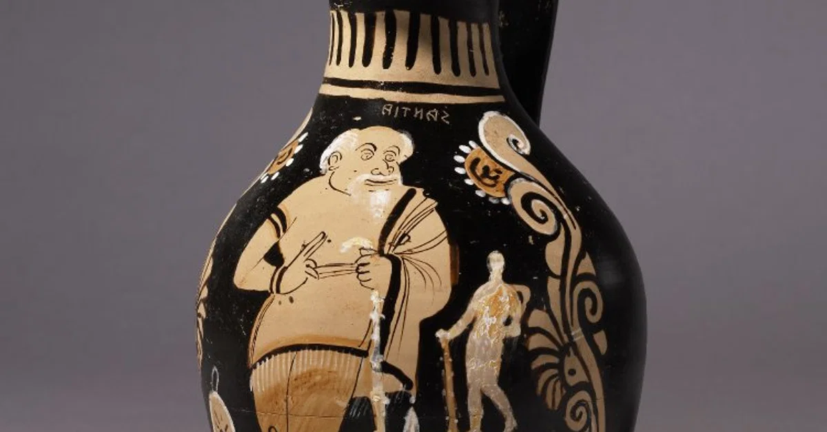 Finalement, Eschyle se lasse du concours et demande à ce que l'on utilise la balance. Dionysos regarde les deux hommes: