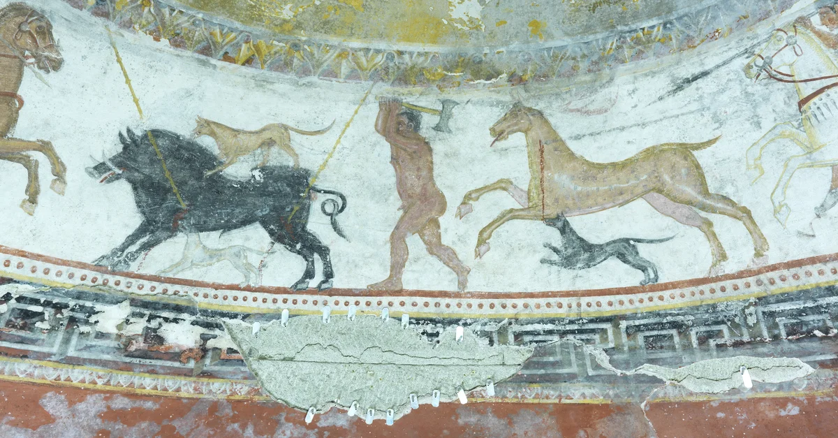 Souvent, les murs des tombes anciennes étaient décorés de peintures monochromes simplifiées, en rouge et blanc, réalisées à partir de matériaux organiques et utilisées de manière continue tout au long de l'Antiquité. Depuis la préhistoire, la couleur rouge et ses nuances étaient associées à la mort dans le contexte funéraire, et dans les peintures funéraires, le rouge était utilisé pour représenter la tête et le torse du corps humain, soulignant leur importance physique en tant que réceptacles de l'âme et de l'esprit.