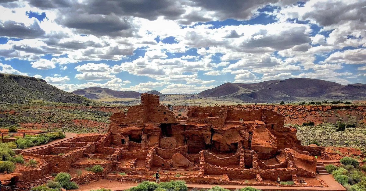 Les habitants de Wupatki construisaient des maisons en pierre perchées au sommet des canyons peu profonds qui menaient au Little Colorado River, et ils commerçaient avec leurs voisins proches et lointains. Les archéologues ont découvert 41 restes d'aras écarlates - utilisés lors de cérémonies religieuses - ainsi que des turquoises, de nombreuses cloches en cuivre et des coquillages provenant de l'océan Pacifique. À Wupatki, on trouve également des kivas ouverts sans toit, courants chez les Pueblos ancestraux, ainsi qu'un terrain de jeu de balle cérémoniel comme ceux utilisés par les Hohokams. Cette cour est la plus septentrionale du sud-ouest ancien. Toutes ces structures datent d'environ 1125-1195 et témoignent de la riche confluence d'idées dans le paysage cérémoniel de Wupatki.