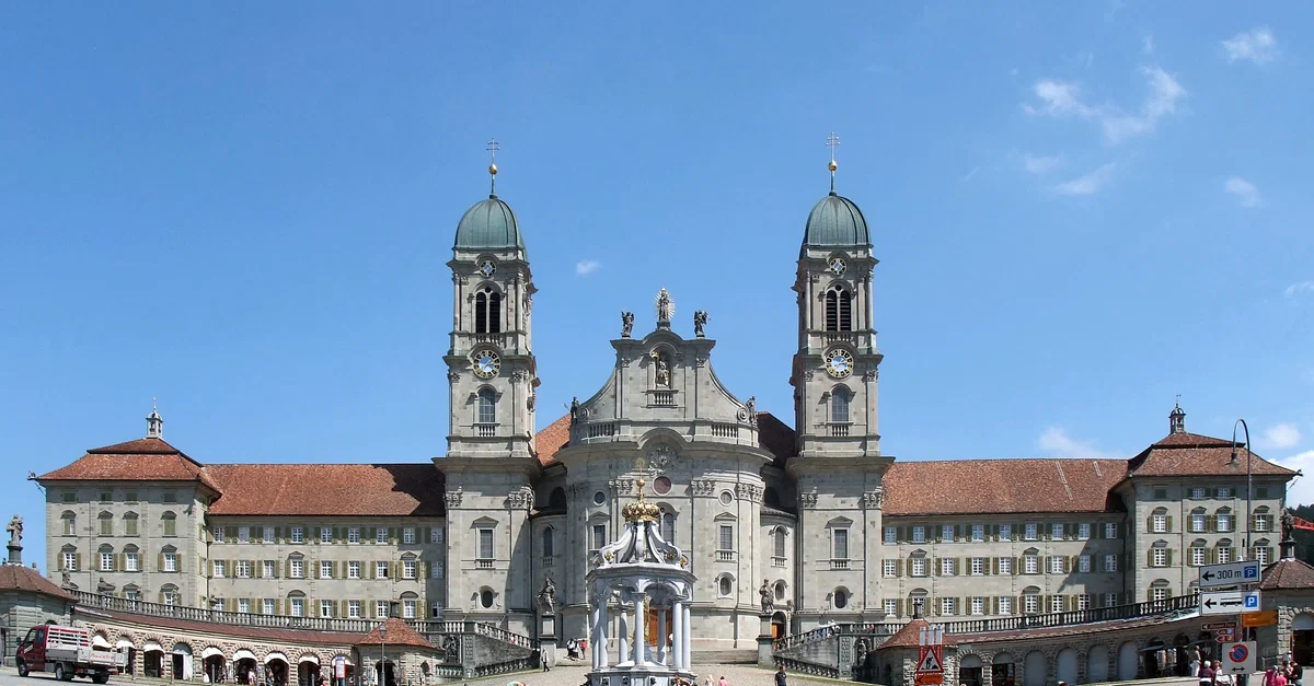 La première structure ecclésiastique, précurseur de l'abbaye d'Einsiedeln, était une église construite sur le site de la cellule occupée par Saint Meinrad avant son assassinat par des voleurs en 861. Au siècle suivant, Otton Ier et la duchesse Regelinda de Souabe (890-958) fondèrent un monastère à Einsiedeln en 935. La route principale d'Einsiedeln croise le côté ouest d'une grande place où se trouve aujourd'hui l'église abbatiale. La façade de l'abbaye d'Einsiedeln donne sur une grande cour semi-circulaire, où se trouve une fontaine en l'honneur de la Vierge Marie.