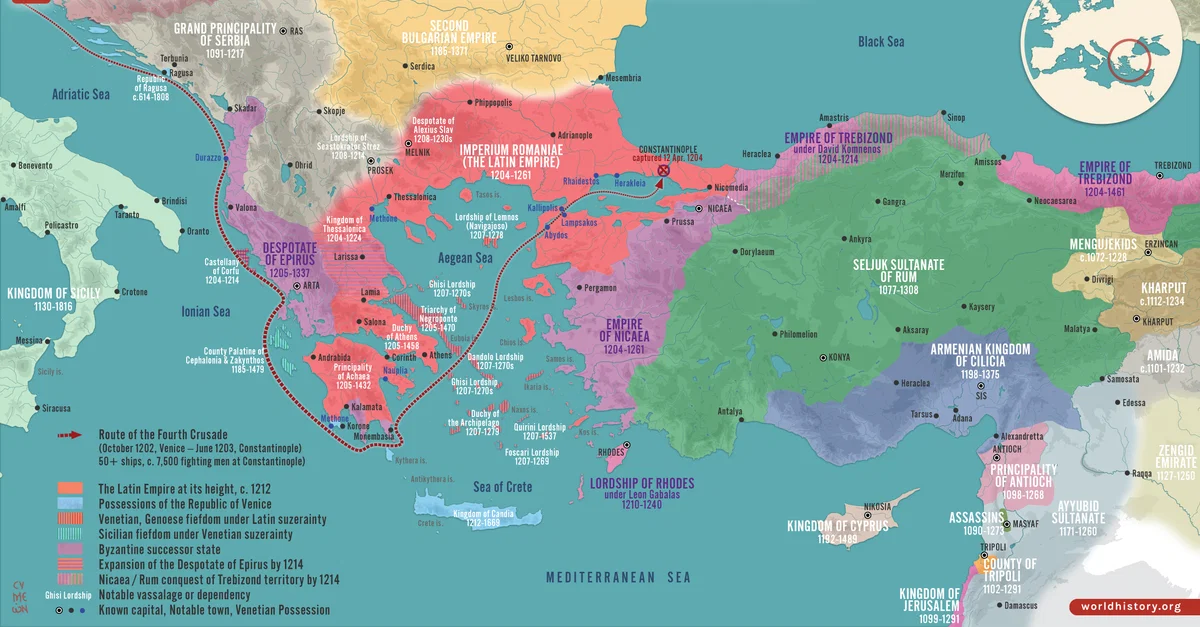 Le pillage de la capitale byzantine, Constantinople, brisa l'Empire byzantin. Alors que les croisés latins et leurs soutiens vénitiens s'établirent en Europe et dans les îles de la mer Égée, trois États grecs successeurs s'élevèrent à la périphérie de l'empire. Le premier, et le plus éloigné, était l'Empire de Trébizonde, sur la rive sud-est de la mer Noire. Vint ensuite le Despotat d'Épire, dans l'Albanie moderne et le nord-ouest de la Grèce. Enfin, l'Empire de Nicée, centré sur l'ancienne ville de Nicée et contrôlant le nord-ouest de l'Anatolie.