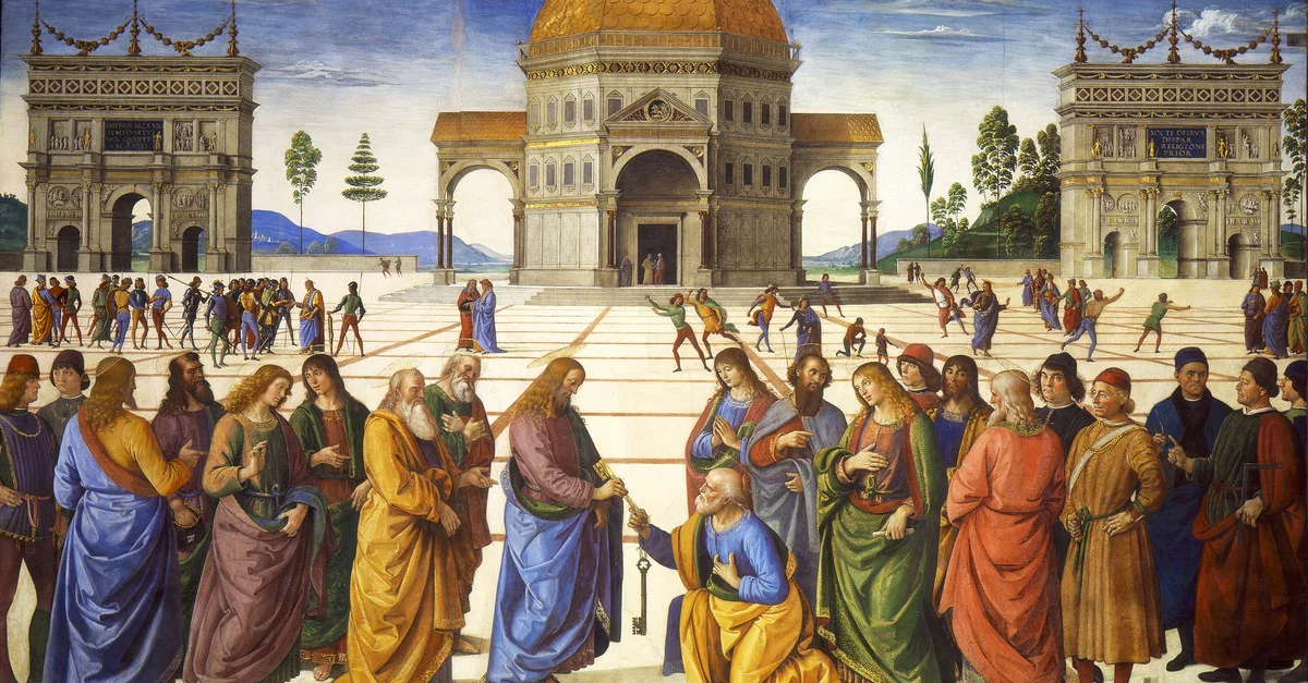 Le panneau de la chapelle Sixtine intitulé La Remise des clés à saint Pierre est un bon exemple de l'amour du Pérugin pour les scènes présentant un sens de l'espace. Dans ce cas, il semble y avoir des hectares d'espace entre les personnages du premier plan et l'église et les arcs de triomphe dessinés avec précision derrière eux. Les techniques de perspective comprennent les lignes convergentes dans le pavage du milieu du tableau et la réduction de la taille des personnages au milieu du tableau. L'équilibre précis de l'image - visible dans les arcs assortis, les caractéristiques architecturales de l'église et la disposition des personnages au premier plan - est renforcé par la ligne asymétrique des arbres à l'arrière-plan.