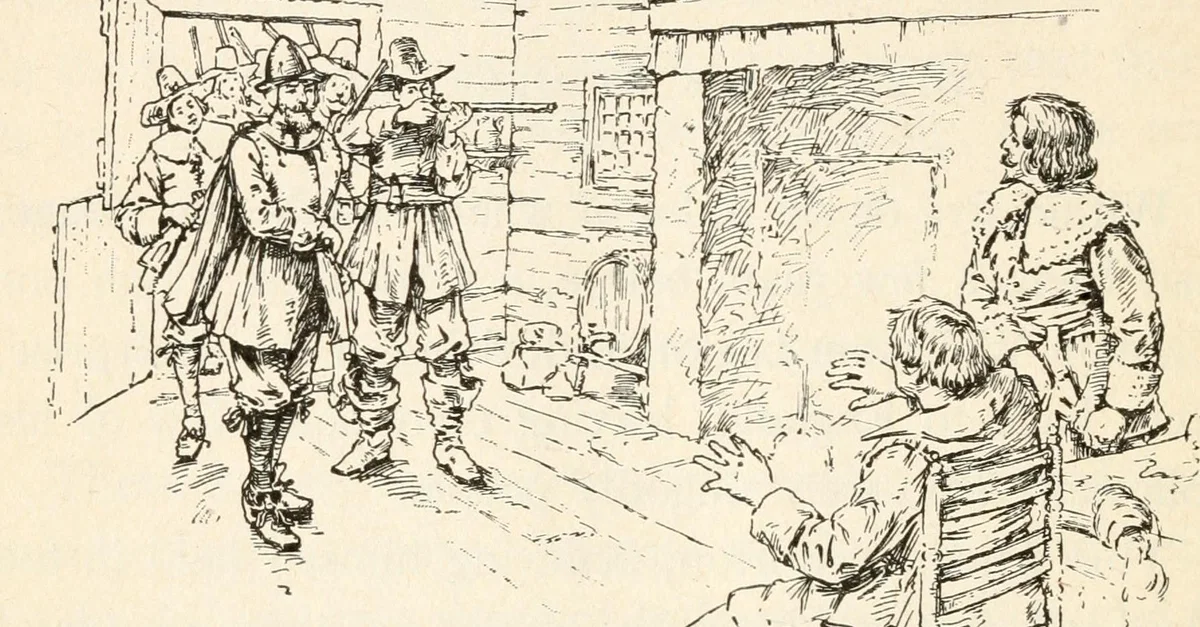 Les Séparatistes, enviant la prospérité et l'espoir de la plantation de Ma-re Mount (qui, selon eux, commençait à se développer et à être en bonne voie pour gagner dans le commerce du castor) conspirèrent contre Mine Host en particulier... et formèrent un groupe contre lui et rassemblèrent toute l'aide qu'ils pouvaient, le considérant comme un grand monstre....Ils s'attaquèrent à Mine honest Host à un endroit appelé Wessaguscus où (par accident) ils le trouvèrent... Les conspirateurs s'amusèrent de Mine honest Host, qui ne leur voulait aucun mal, et ils étaient si joyeux qu'ils se régalèrent et se mirent à boire comme s'ils avaient obtenu un grand prix. [Plus tard, après avoir bu et s'être endormi, Mine Host s'échappa et retourna à Mount Ma-re]. Leur grand chef, le capitaine Crevette, s'emporta avec fureur et déchira ses vêtements de colère en voyant le nid vide et leur oiseau disparu. (141-143)