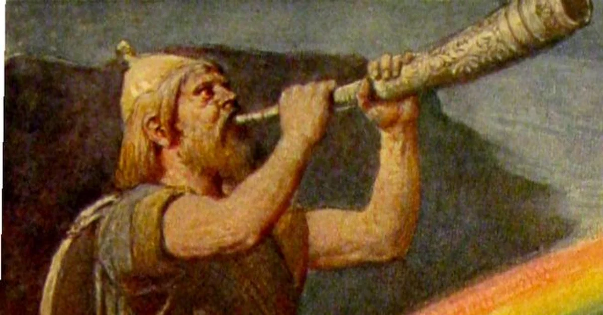Une autre information sur Heimdall nous vient de la même source, à la strophe 27, où la prophétesse dit qu'elle connaît la corne du dieu (hljōþ) et qu'elle est cachée sous l'arbre sacré, Yggdrasil. Il y coule un ruisseau qui semble provenir de l'œil d'Odin, celui qu'il a sacrifié pour obtenir la sagesse de l'esprit de Mimir. La corne est-elle donc enterrée là jusqu'à ce que Heimdall annonce le Ragnarök? Ou s'agit-il plutôt du sens de l'ouïe et non d'un objet? Peut-être Heimdall a-t-il placé son oreille à cet endroit comme Odin l'a fait avec son œil, ce qui implique un lien avec l'Arbre du Monde, en d'autres termes avec l'ordre cosmique.