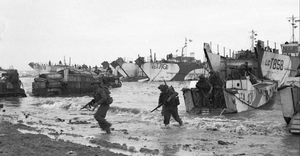 La flotte alliée, composée de 7 000 navires de toutes sortes, quitta les ports de la côte sud de l'Angleterre, tels que Falmouth, Plymouth, Poole, Portsmouth, Newhaven et Harwich. Dans le cadre d'une opération portant le nom de code Neptune, les navires se rassemblèrent au large de Portsmouth dans une zone appelée "Piccadilly Circus", d'après le carrefour routier très fréquenté de Londres, puis firent route vers la Normandie et les zones d'assaut. Dans le même temps, des planeurs et des avions se dirigèrent vers la presqu'île de Cherbourg, à l'ouest, et vers Ouistreham, à l'est de la zone prévue pour le débarquement. Les parachutistes des 82e et 101e divisions aéroportées américaines attaquèrent à l'ouest pour tenter de couper Cherbourg. À l'extrémité est de l'opération, les parachutistes de la 6e division aéroportée britannique devaient sécuriser les ponts et le flanc est de l'invasion.