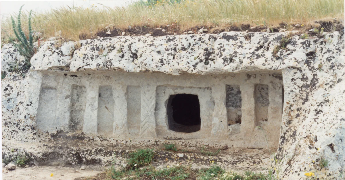 Les premières fouilles archéologiques effectuées dans cette petite péninsule d'environ 2 km de long et 700 m de large ont été réalisées vers la fin du XIXe siècle, et environ 300 tombes rupestres artificielles ont été identifiées, certaines d'entre elles étant des tombes à Tholos, avec des entrées frontales ou par des puits qui s'ouvrent sur le sol rocheux. Elles sont situées en plusieurs points de la péninsule où, dans la zone centrale, une autre nécropole d'enchytrismòs (enterrements en vase) a été identifiée, avec des cadavres placés dans de grandes jarres en terre cuite insérées dans de petites cavités naturelles dans le sol.