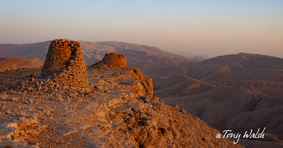 Cependant, pour moi, le site ancien le plus évocateur d'Oman est sans doute un certain nombre de tombes à cairn, qui dans cette région sont généralement appelées"tombes en ruches" en raison d'une certaine similitude avec les ruches "skep" du nord-ouest de l'Europe. Perché au bord d'une falaise à 1800 m d'altitude, un groupe de ces tombes a été daté de 3500 à 2000 avant notre ère. Leur situation extraordinaire, avec vue sur des collines basses et un désert de sable au loin, crée un sentiment de drame évocateur, probablement la raison pour laquelle leurs bâtisseurs ont choisi un endroit aussi inaccessible non seulement pour construire ces tombes, mais aussi pour y enterrer leurs morts, bien qu'ils aient dû vivre dans les vallées en contrebas.