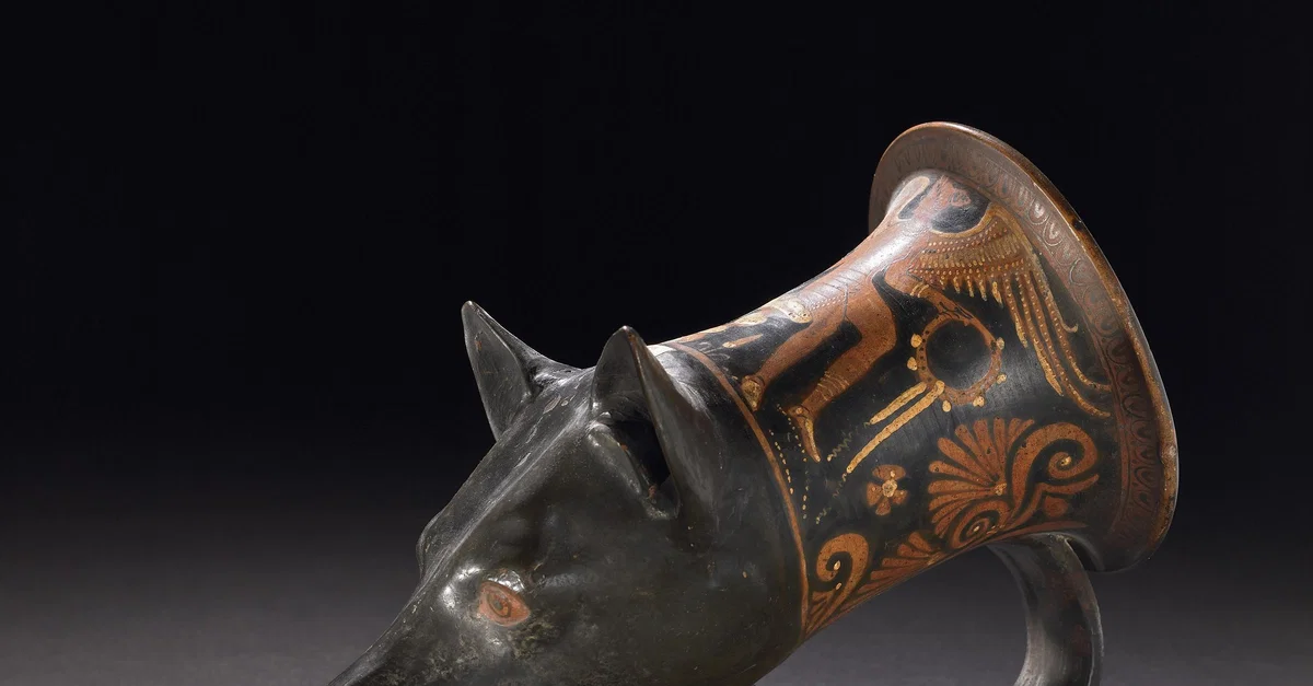 Le rhyton, récipient cérémoniel à boire, était souvent orné d'une tête de chien à sa base, d'où s'élevait une coupe conique. Ces rhytons (ou rhyta) représentent les chiens (souvent des lévriers) avec un collier de couleur vive orné d'images de la vie du propriétaire ou d'œuvres mythologiques. D'autres colliers en cuir, représentés dans l'art, sont plus minces et probablement utilisés par les classes inférieures (mais pas strictement, bien sûr). À cette époque (c. 2500-2500 av. J.-C.), le travail du métal en Grèce avait progressé au point qu'il était possible de fixer au collier des anneaux de fer auxquels on pouvait attacher une laisse; avec le collier à pointes, qui était peut-être auparavant maintenu par des lanières de cuir, on utilisait des fermoirs en métal pour le maintenir autour du cou du chien.