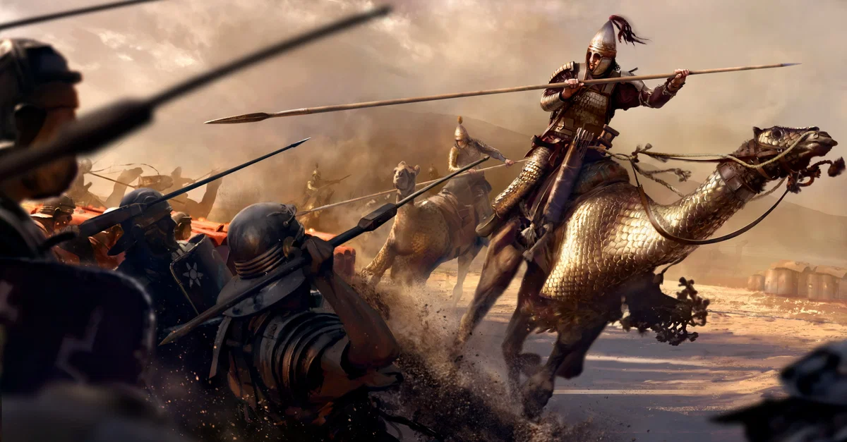 Au début du Premier Triumvirat, le commandant romain Marcus Licinius Crassus (115-53 av. J.-C.), en quête de gloire et de richesse, mena sept légions dans une attaque non provoquée contre les Parthes à la bataille de Carrhes, en 53 avant J.-C. La bataille s'avéra un désastre absolu dès le début. L'armée romaine n'avait jamais rien rencontré de comparable à la cavalerie parthe, hautement qualifiée et spécialement entraînée à combattre en terrain découvert. Le résultat de la bataille fut l'un des pires désastres militaires de l'histoire romaine. Au final, 20 000 soldats romains furent tués, 10 000 furent capturés et seulement 5 000 échappèrent au bain de sang. Les Parthes s'étaient révélés être des ennemis redoutables. La principale force de la guerre parthe, démontrée à Carrhes, était une armée entièrement composée de cavaliers: des cataphractes lourdement armés portant des lances et des archers montés légèrement armés. Ils se déplaçaient rapidement et tiraient vite, mettant l'accent sur la mobilité et la maîtrise de l'équitation avec des charges rapides et des feintes de retraite.