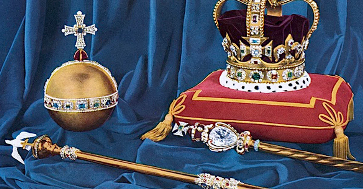 Après l'exécution de Charles Ier d'Angleterre (r. de 1625 à 1649) en janvier 1649 pendant les guerres civiles anglaises (1642-1651), la monarchie fut abolie en Angleterre. L'une des conséquences de cette abolition fut le démantèlement des insignes royaux, qui furent vendus ou transformés en pièces de monnaie. Après la restauration des Stuart en 1660 et le retour de la monarchie sous la forme de Charles II d'Angleterre (r. de 1660 à 1685), un nouvel ensemble d'insignes royaux était nécessaire pour un nouveau couronnement. Le couronnement du roi Charles à l'abbaye de Westminster, le 23 avril 1661, fut une affaire splendide, avec pompe, cérémonie et beaucoup de pailettes. Depuis lors, la couronne, le sceptre et le globe du monarque sont utilisés lors des couronnements.