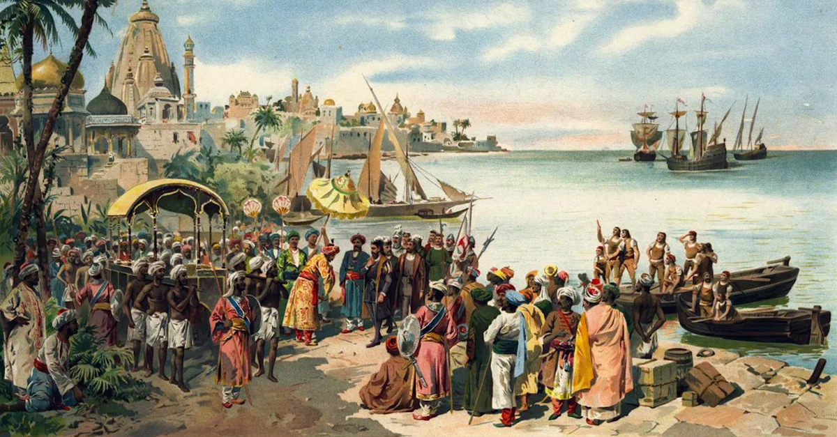 Vasco de Gama quitta Malindi pour l'Inde le 24 avril 1498 et arriva à Calicut moins d'un mois plus tard. Il y trouva un royaume hindou, dirigé par le roi de Calicut, le zamorin ou samoothiri. Lorsque de Gama montra au zamorin les cadeaux qu'il avait apportés, ils furent immédiatement rejetés, mais après une audience tendue et confuse et des démonstrations de force des deux côtés, de Gama fut autorisé à faire du commerce. Toutefois, le zamorin lui fit comprendre que de Gama devrait payer des droits de douane, comme tout autre marchand.