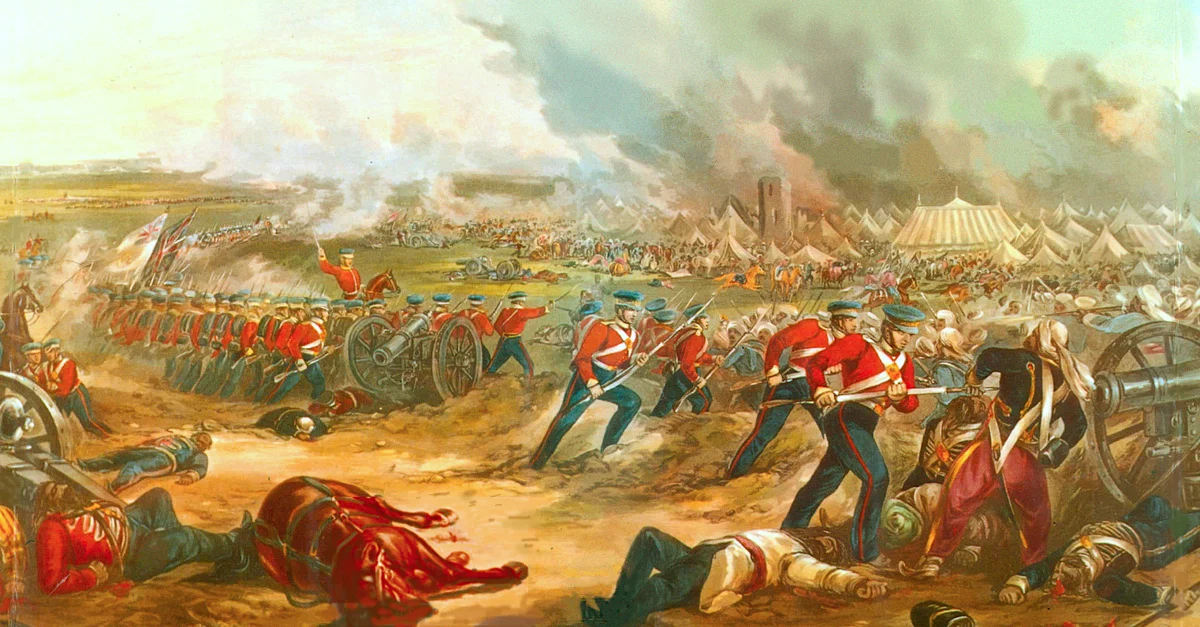 Un camp en feu d'un côté du village, des mines et des chariots de munitions explosant dans toutes les directions, les ordres donnés à voix haute pour éteindre les incendies allumés par les cipayes, les salves tirées si les Sikhs s'aventuraient trop près, le grondement des canons monstrueux, les tirs incessants des plus petits, le sifflement continu des obus, des boulets et des balles, le son des clairons, le battement des tambours et les cris de l'ennemi, ainsi que la soif intense, la fatigue et le froid, sans savoir si le reste de l'armée était vainqueur ou vaincu, tout cela contribua à rendre cette nuit vraiment terrible.