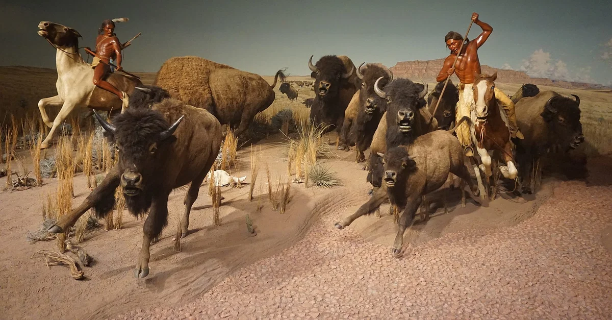 Avant l'arrivée du cheval dans la région, et pour certaines nations même après, jusqu'à ce qu'elles ne maîtrisent l'équitation, le bison était chassé à pied. Chaque nation avait ses propres rituels avant la chasse et ses propres histoires concernant ces événements, mais en général, les bisons étaient conduits en haut des falaises, sur des étendues d'eau gelée ou dans des enclos - fabriqués ou naturels - où ils étaient tués. La spécialiste Adele Nozedar commente: