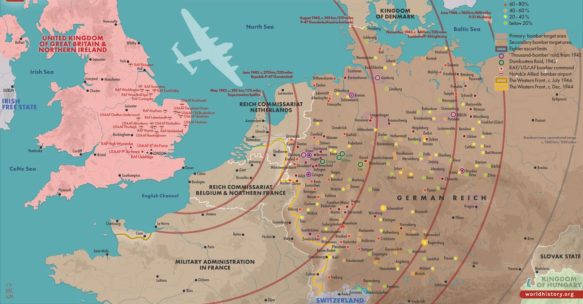 La RAF comprenait de nombreux personnels de l'Empire britannique tels que l'Australie, la Nouvelle-Zélande et le Canada, ainsi que des équipages français, polonais et américains, entre autres. L'USAAF était représentée par la huitième armée de l'air, basée en Grande-Bretagne, commandée par Ira C. Eaker (1896-1987), et en action en Europe à partir d'août 1942. Les deux forces aériennes déployèrent des bombardiers au-dessus de l'Allemagne et de nombreuses autres cibles dans l'Europe occupée, en Italie et en Méditerranée.