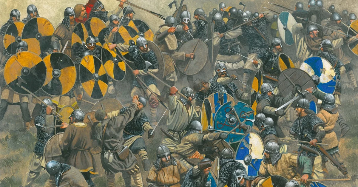 Olaf et Constantin firent le premier pas, ordonnant à leurs guerriers de former un mur de boucliers - en verrouillant leurs boucliers les uns contre les autres, une rangée de soldats créa un mur de bois et de fer presque incassable. Les Anglais levèrent leurs boucliers et s'avancèrent en hurlant leur cri de guerre:"Ut, ut!". ("Dehors, dehors !"), ordonnant à leurs ennemis de fuir. Les deux armées s'échangèrent ensuite des projectiles - flèches, javelots et pierres - avant de s'affronter. Ces combats entre les murs de boucliers se transformaient souvent en bousculades, chaque camp s'efforçant de repousser et de vaincre l'autre. Pendant ce temps, les haches frappaient les boucliers de leurs adversaires et les lances piquaient et s'enfonçaient à travers les brèches du mur.