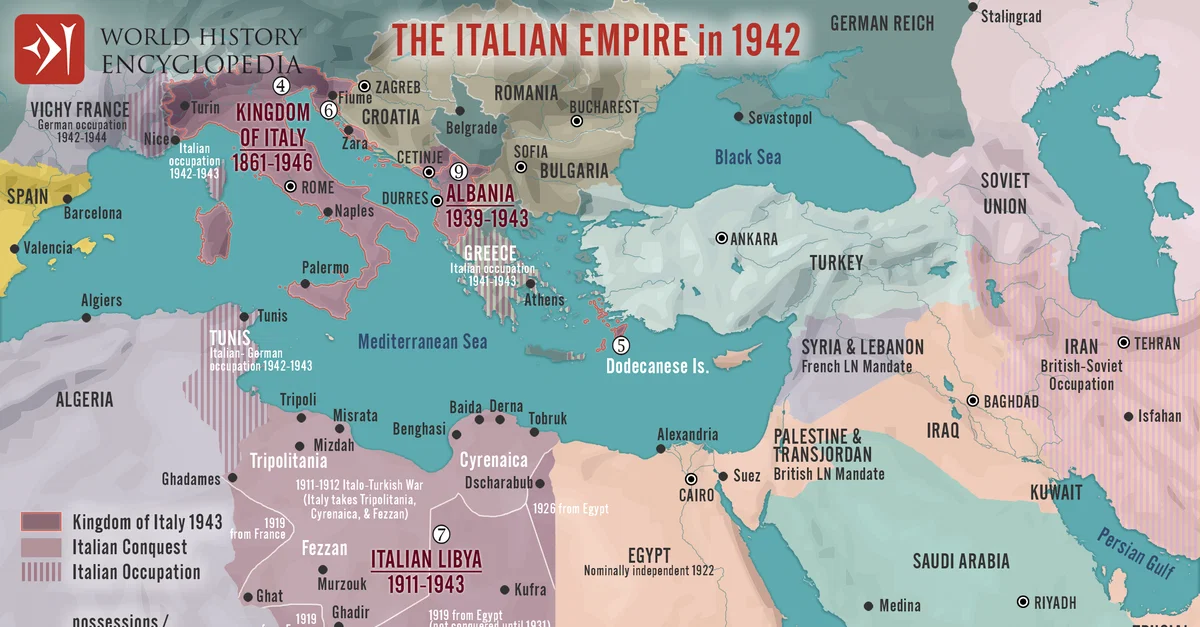 L'un des projets les plus convoités de la politique coloniale italienne était de s'assurer une colonie africaine en Méditerranée. C'est pourquoi l'Italie mena et gagna la guerre italo-turque de 1911-1912 pour le contrôle de la Tripolitaine et de la Cyrénaïque. Ces deux possessions d'Afrique du Nord furent ensuite unifiées en 1934 pour former la colonie de Libye, qui resta sous contrôle italien jusqu'en 1943.