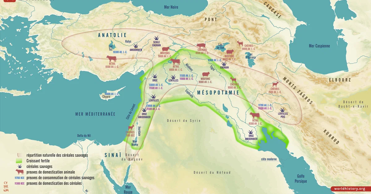 Le terme Croissant fertile, inventé en 1916 par l'égyptologue James Henry Breasted, désigne une large bande de terre qui s'étend de la Méditerranée orientale à la Mésopotamie en passant par l'Anatolie. Couvrant une partie des territoires actuels de l'Irak, de la Syrie, du Liban, d'Israël, de la Palestine, de la Jordanie, de la Turquie et de l'ouest de l'Iran, cette région tire son nom de la richesse exceptionnelle de ses sols, de la diversité de ses écosystèmes et de ses réseaux fluviaux, notamment le Tigre et l'Euphrate. Les découvertes archéologiques montrent qu'au IXe millénaire avant notre ère, les communautés étaient passées d'un mode de vie nomade à une agriculture sédentaire, cultivant des céréales telles que le blé et l'orge et domestiquant des animaux tels que les moutons, les chèvres et les porcs. Ces avantages environnementaux et technologiques ont créé les bases matérielles nécessaires à la croissance démographique, à la différenciation sociale et à des formes d'organisation communautaire de plus en plus complexes.