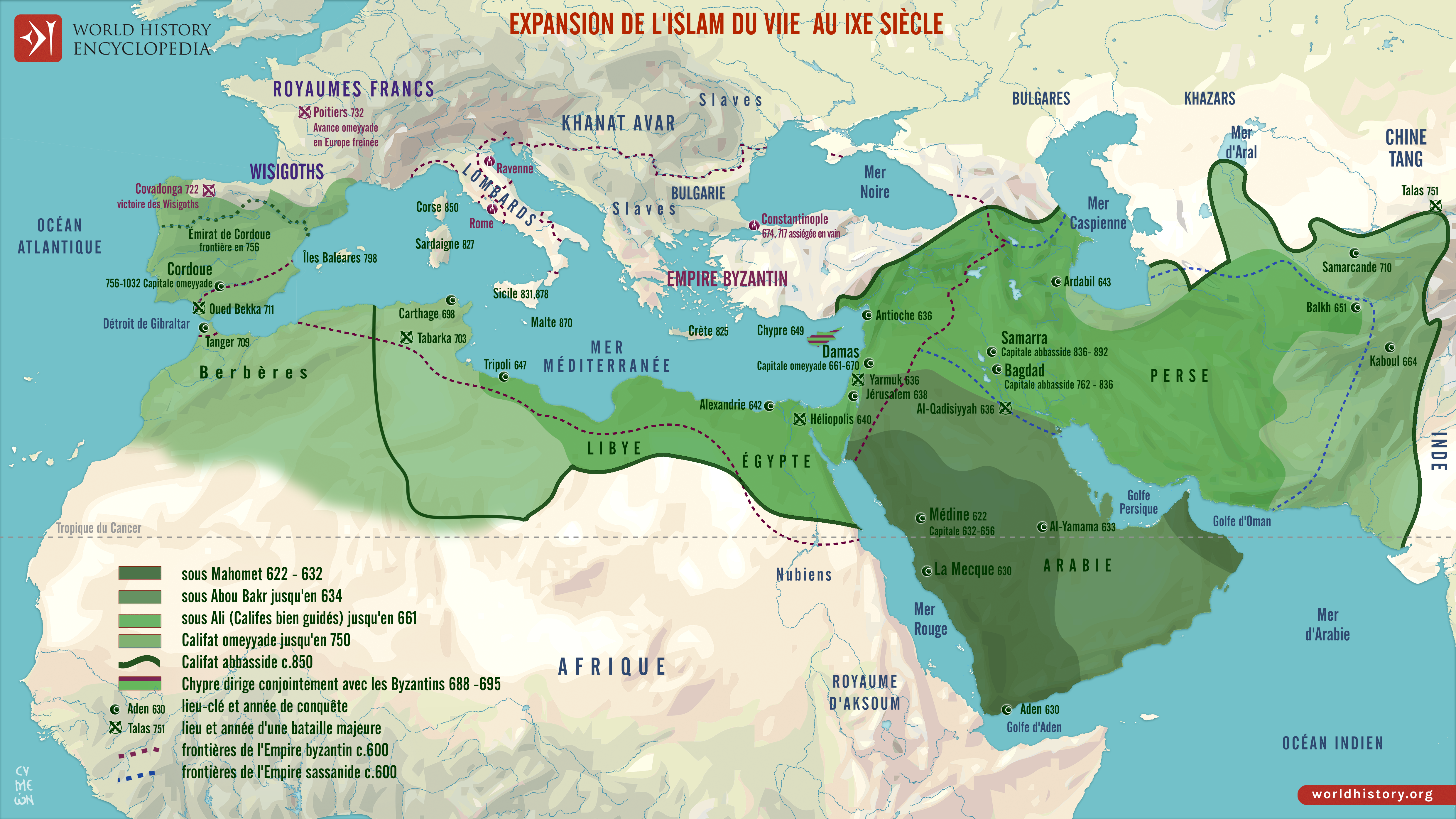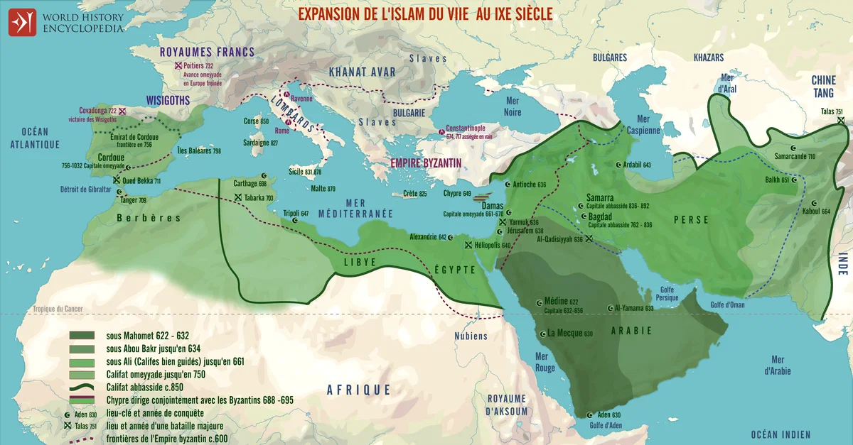 Cette carte illustre l'essor et l'expansion rapide de l'islam depuis l'époque du prophète Mahomet (622-632 ap. J.-C.) jusqu'aux grands califats des VIIe et IXe siècles. Partant d'Arabie, la nouvelle foi et ses armées se répandirent sous les califes bien guidés (632-661), puis sous le califat omeyyade (661-750) et le califat abbasside (750-900 environ), créant en quelques générations l'un des empires les plus vastes et les plus dynamiques de l'histoire.