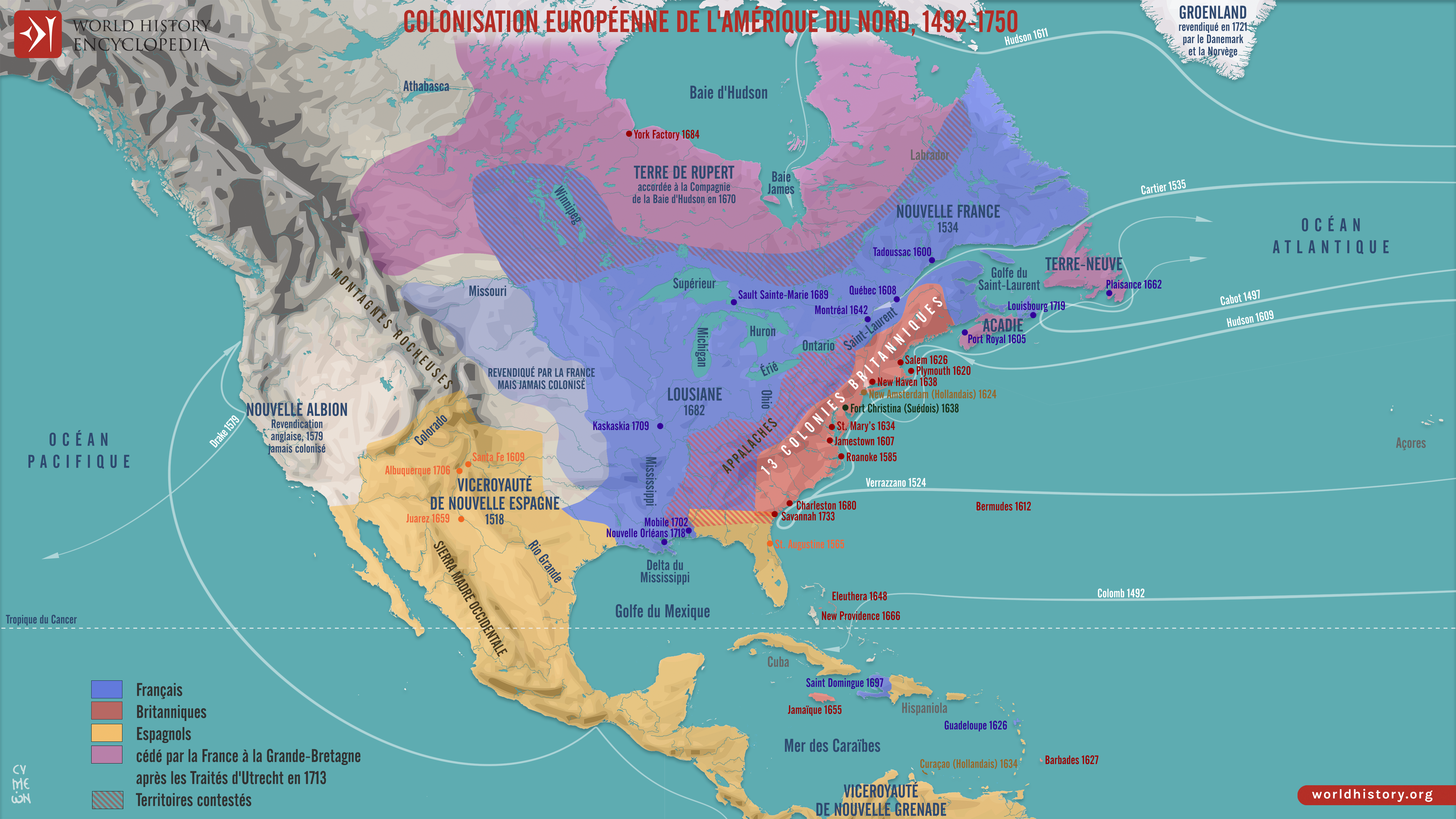 Au cours de ces siècles, les empires construisirent des colonies, des comptoirs commerciaux et revendiquèrent des territoires étendus. L'Espagne dominait le sud et le sud-ouest, la France détenait le Canada et la vallée du Mississippi, et la Grande-Bretagne progressait sans relâche le long de la côte atlantique. Le traité d'Utrecht (1713) mit fin à la guerre de Succession d'Espagne et obligea la France à céder Terre-Neuve, la baie d'Hudson et l'Acadie à la Grande-Bretagne, un remaniement qui jeta les bases des luttes futures pour le contrôle du continent.