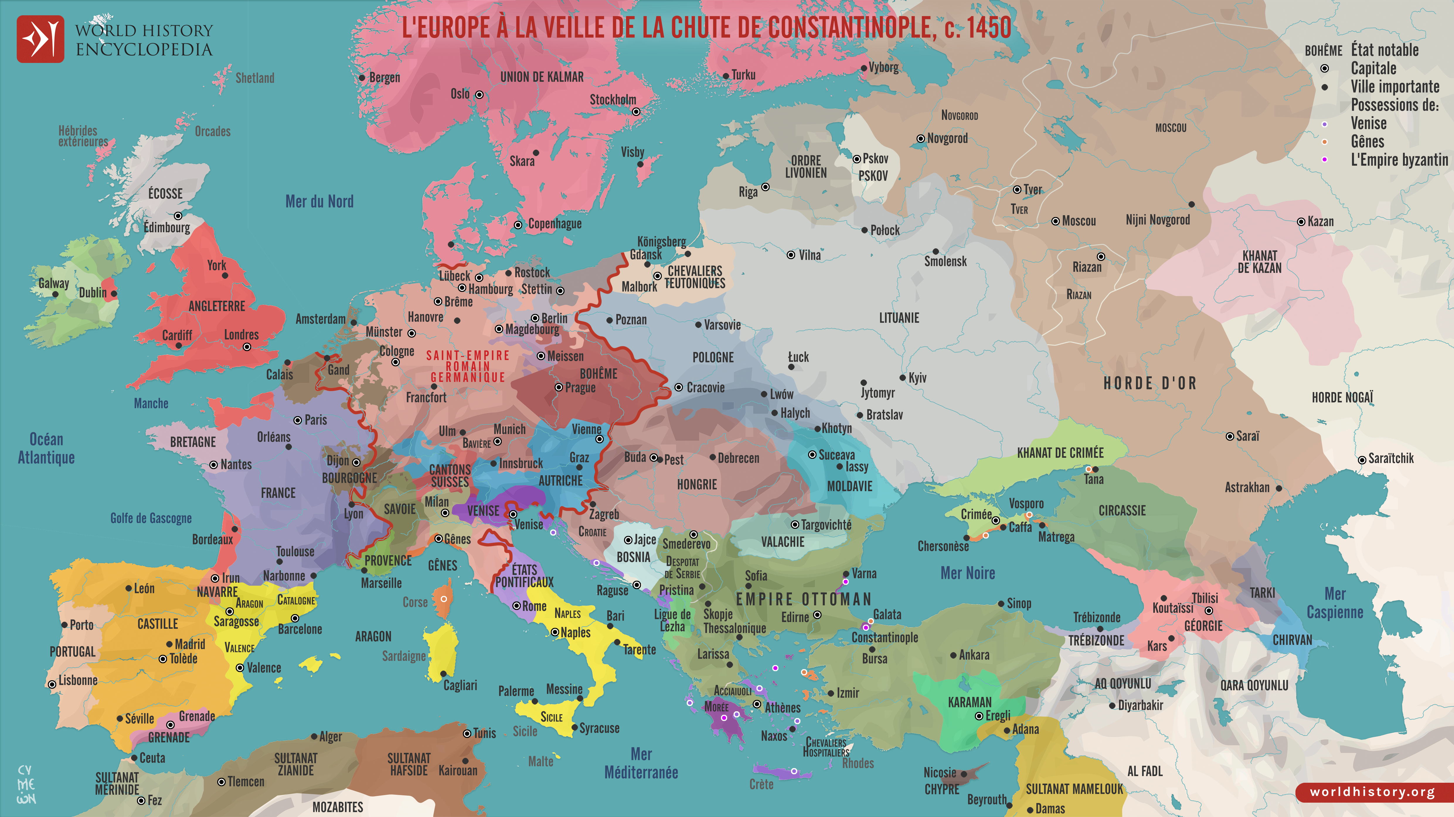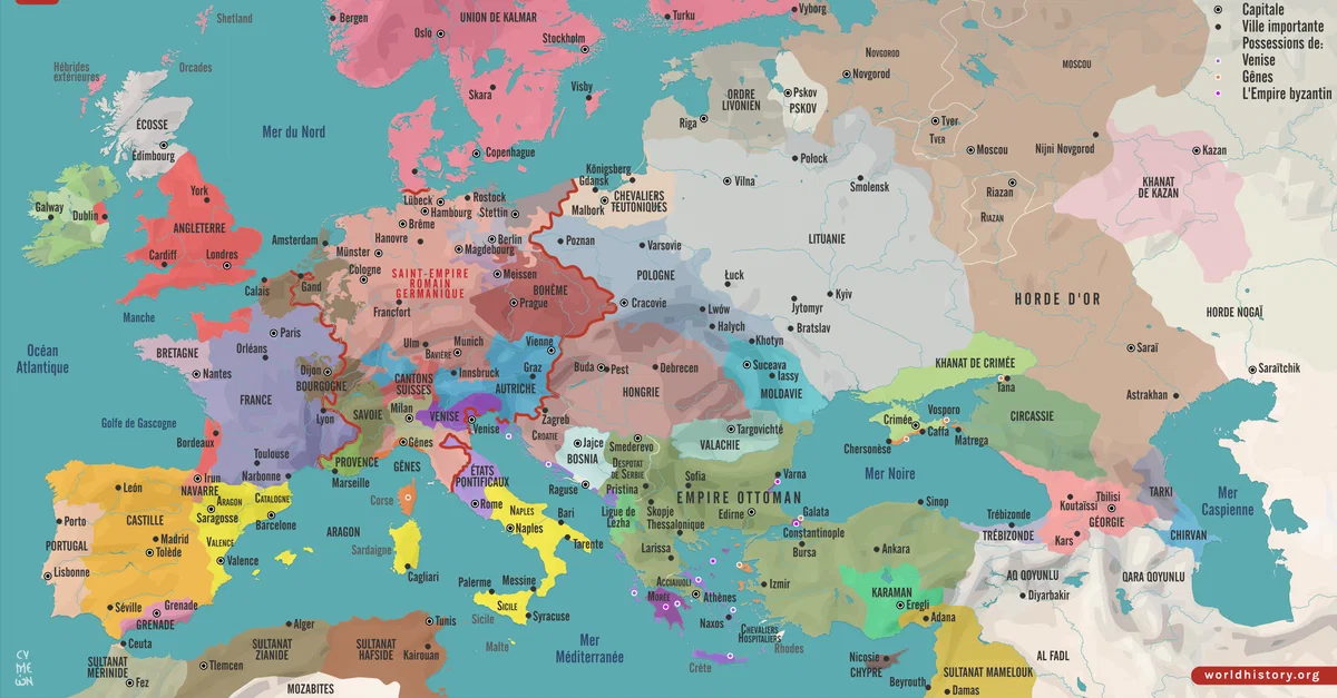 Vers 1450, l'Europe et le Moyen-Orient étaient caractérisés par la fragmentation, le déclin des puissances médiévales et l'émergence de nouveaux États régionaux. L'Empire byzantin s'était réduit à Constantinople et à quelques avant-postes, tandis que l'Empire ottoman sous Mourad II (r. de 1421 à 1451) exerçait une forte pression sur ses frontières, préparant le terrain pour la chute imminente de la ville. Dans l'Occident latin, la France sortit de la phase finale de la guerre de Cent Ans en tant que monarchie plus unifiée sous Charles VII (r. de 1422 à 1461), et les couronnes de Castille et d'Aragon renforcèrent leur autorité avant leur union dynastique ultérieure. En Europe de l'Est, le pouvoir politique restait dispersé: Moscou, Tver, Riazan et Novgorod fonctionnaient comme des principautés semi-autonomes encore officiellement liées, bien que de manière inégale, à la Horde d'Or, dont l'autorité s'affaiblissait mais n'était pas encore brisée. Au Moyen-Orient, le sultanat mamelouk contrôlait l'Égypte et la Syrie, tandis que les Qara Qoyunlu dominaient une grande partie de l'Iran et de l'Irak, formant une mosaïque de dynasties rivales.