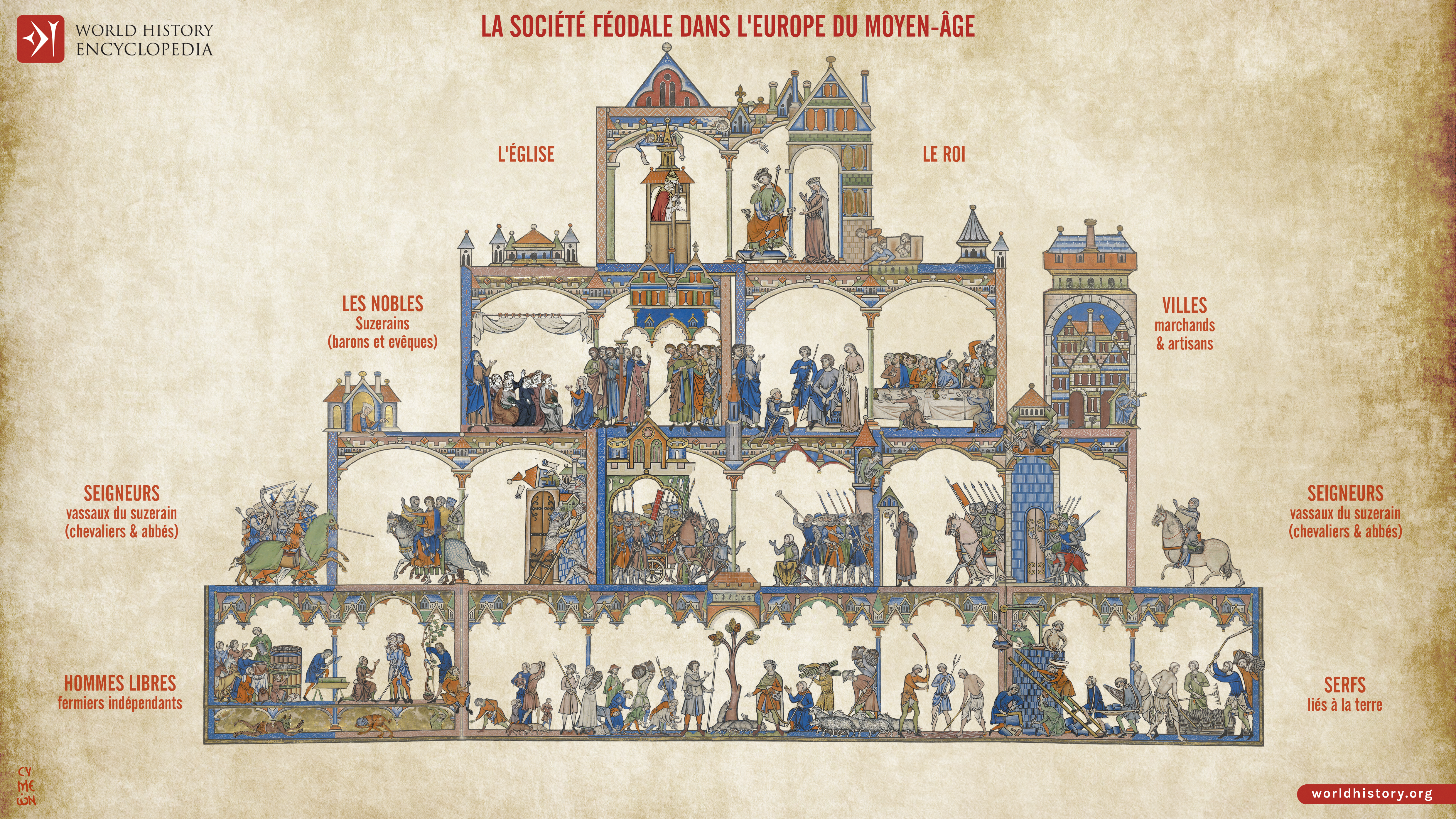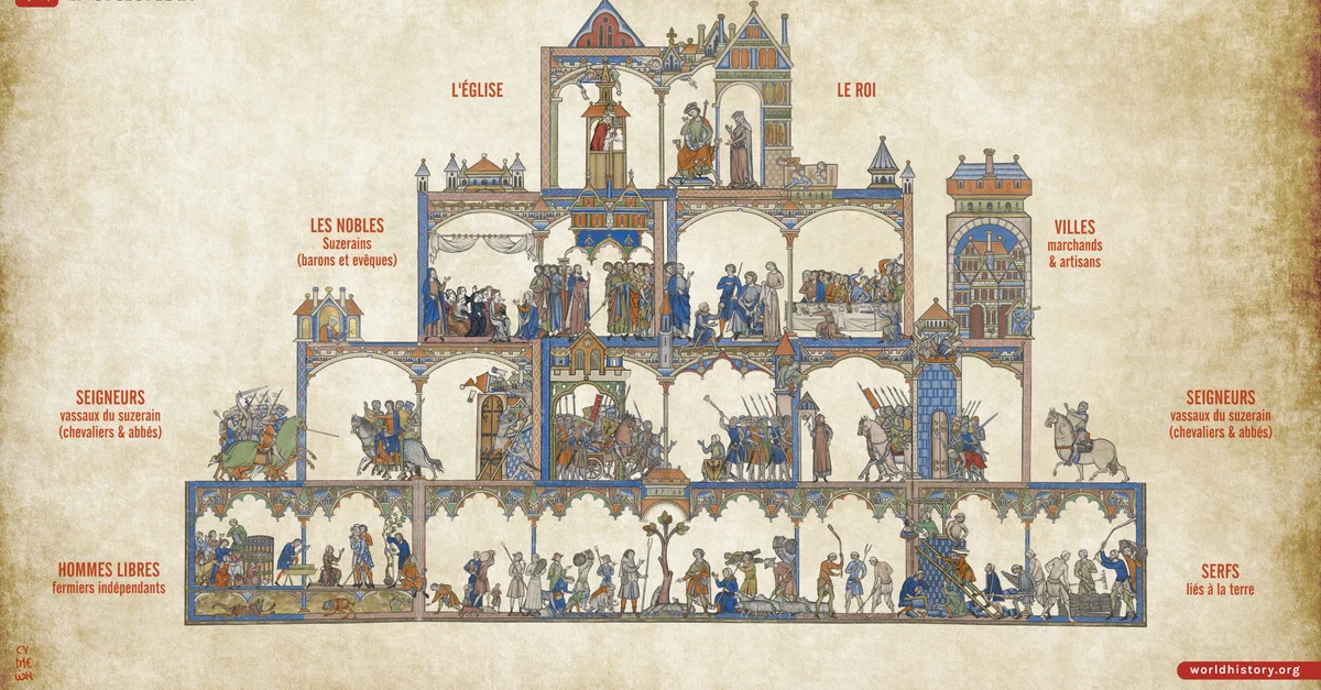 Cette représentation de l'Europe occidentale médiévale (Xe-XIIIe siècles) illustre la hiérarchie féodale composée du roi, des nobles, des seigneurs et des paysans, et souligne le pouvoir et l'influence parallèles de l'Église. Les terres étaient divisées en unités appelées « fiefs », accordées par la Couronne ou les seigneurs de haut rang, parallèlement aux possessions de l'Église, en échange de loyauté, de service militaire ou de loyer. Les évêques et les abbés apparaissent aux côtés des dirigeants séculiers comme un pilier central et indépendant de l'autorité, reflétant les vastes propriétés foncières de l'Église, son pouvoir de loyauté et son influence sur la loi et la gouvernance. La structure distingue également les hommes libres, les paysans indépendants et les serfs, qui étaient liés à la terre, soulignant les conditions variées au sein de la classe paysanne.