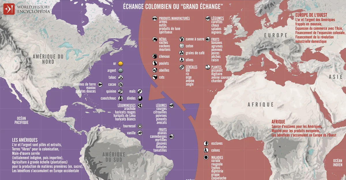 Une infographie illustrant les échanges de maladies, d'animaux, de plantes, de populations et de technologies entre les Amériques, l'Afrique et l'Eurasie à la suite du voyage de Christophe Colomb à travers l'Atlantique en 1492, connu sous le nom d' Échange Colombien ou Grand Échange (d'après le livre du même nom publié par Alfred W. Crosby en 1972).