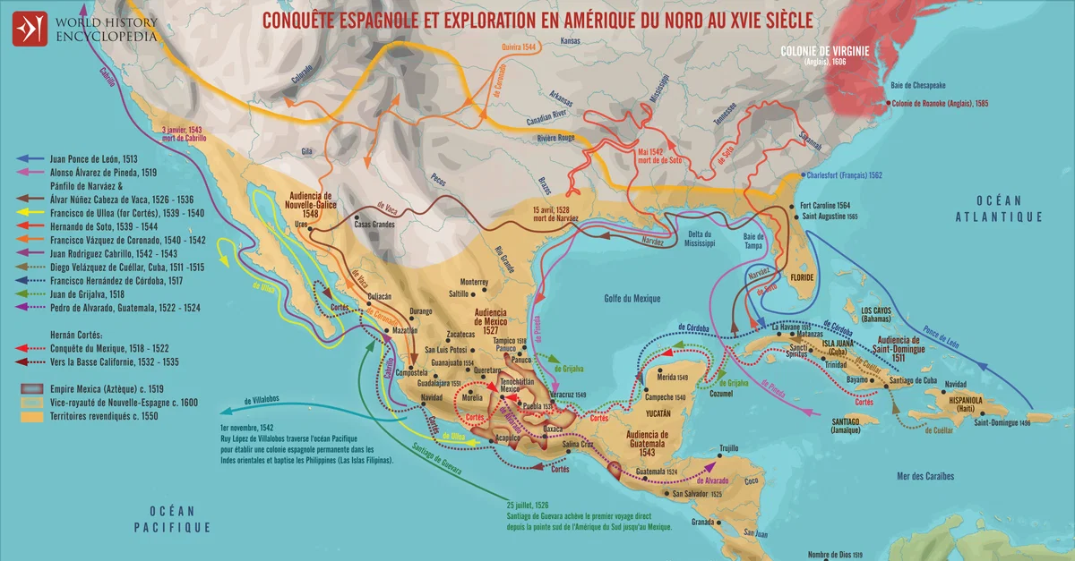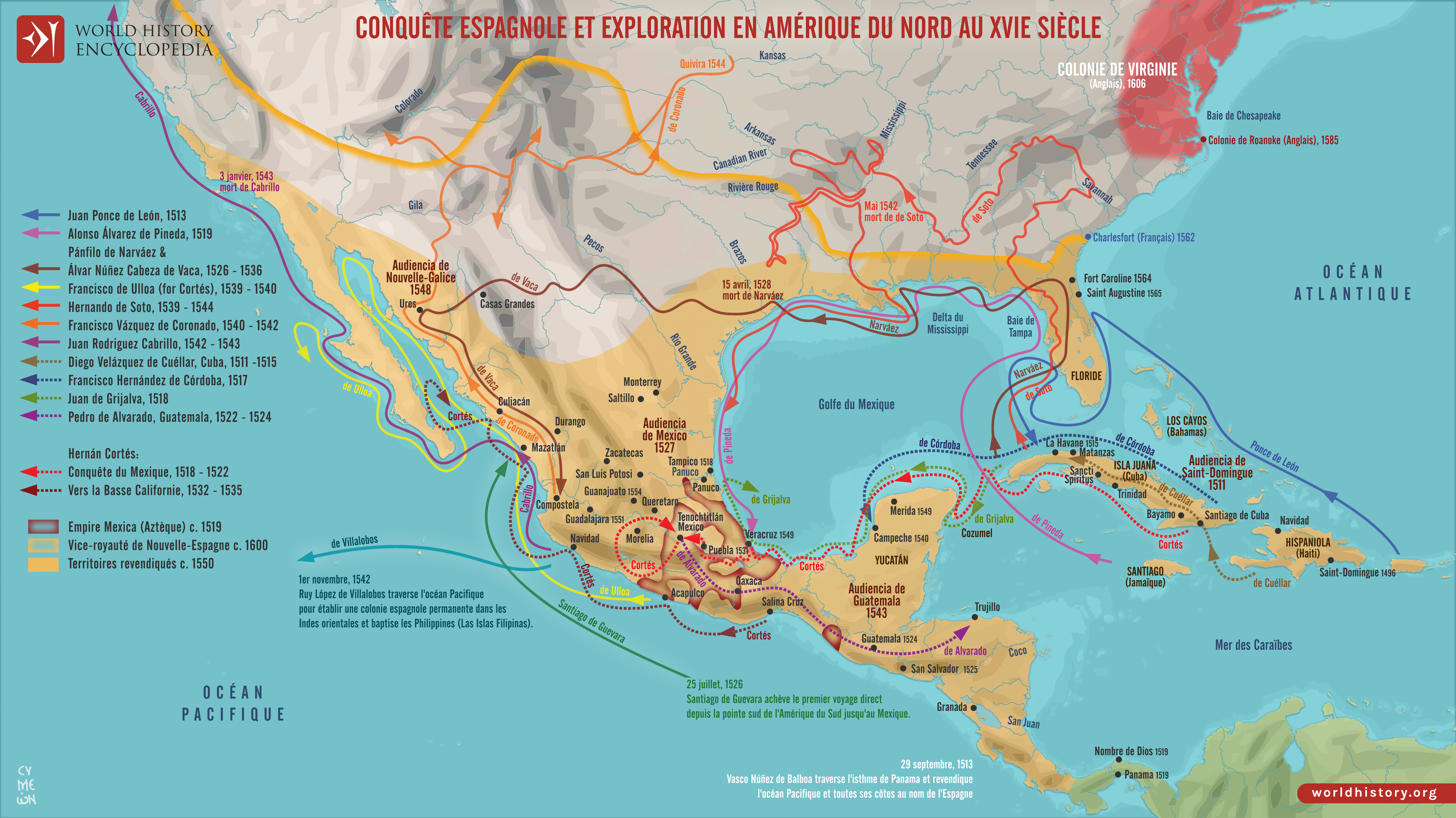 Après leurs premières conquêtes dans les Caraïbes, les expéditions espagnoles renversèrent l'empire aztèque (1519-1521) et l'empire inca (1532-1533), s'assurant ainsi de vastes nouveaux territoires. Au milieu du XVIe siècle, l'Espagne contrôlait une grande partie de l'Amérique centrale et occidentale, le Mexique et la moitié sud de ce qui est aujourd'hui les États-Unis, de la Floride à la côte pacifique. Alors que de nombreuses régions restèrent peu colonisées pendant des siècles, l'Espagne revendiqua et gouverna grâce à un vaste réseau administratif et missionnaire qui remodela les sociétés autochtones et jeta les bases du monde hispanophone.