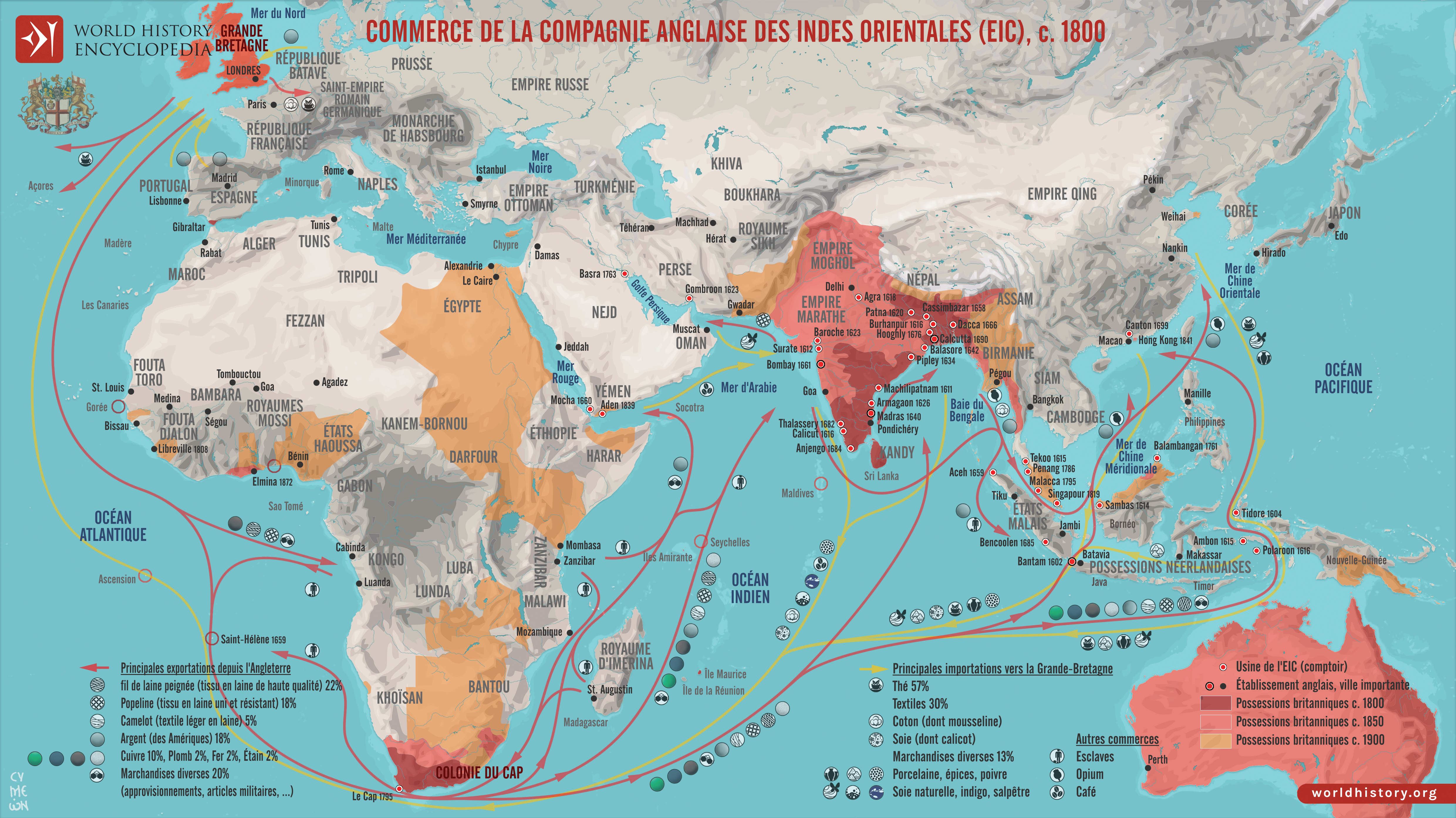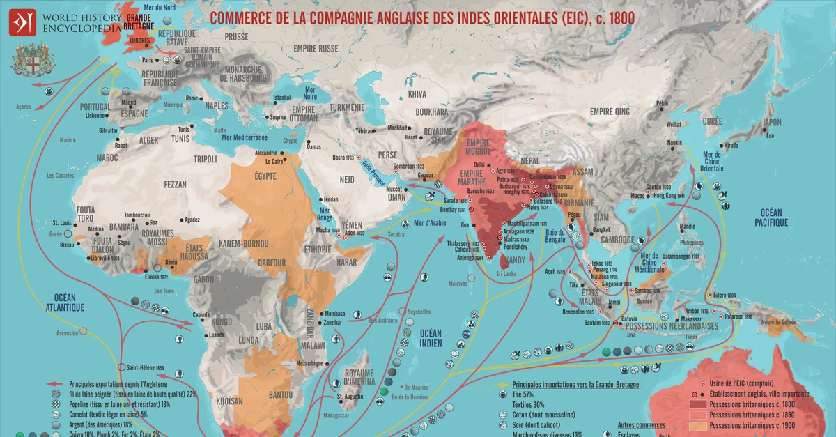 La Compagnie anglaise des Indes orientales (EIC) fut créée par charte royale le 31 décembre 1600 sous le règne de la reine Élisabeth Ire (r. de 1558 à 1603), qui lui accorda le monopole du commerce anglais à l'est du cap de Bonne-Espérance. Initialement conçue en tant qu'entreprise commerciale, la Compagnie se concentra sur les produits asiatiques de grande valeur, tels que les épices, les textiles, le thé et, plus tard, l'opium, commercialisés en Inde, en Asie du Sud-Est et en Chine. Au début du XVIIe siècle, l'EIC avait mis en place un réseau croissant de comptoirs côtiers, s'intégrant dans les systèmes commerciaux existants de l'océan Indien tout en rivalisant avec ses concurrents portugais et néerlandais. Son succès reflétait les grandes tendances du début de l'ère moderne: expansion maritime, mercantilisme et intégration de marchés lointains dans une économie mondiale.