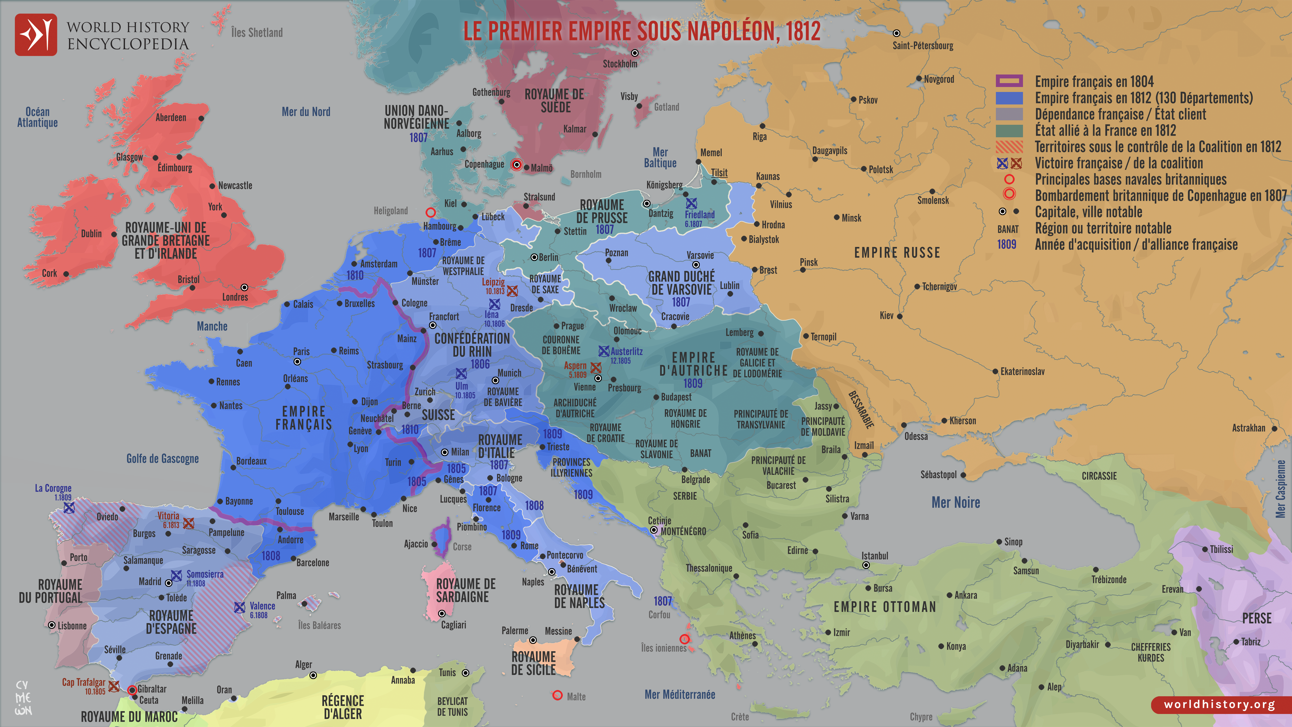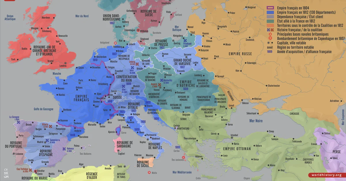 Le Premier Empire, fondé sous Napoléon Bonaparte (empereur de 1804 à 1814, puis brièvement en 1815), marqua l'apogée de la puissance française en Europe après la Révolution française. Grâce à des campagnes militaires soutenues et à une restructuration politique, Napoléon étendit le contrôle ou l'influence de la France sur une grande partie de l'Europe continentale, de la péninsule ibérique à l'Europe centrale et orientale, et de la mer du Nord au sud de l'Italie. Cette expansion fut rendue possible par une combinaison d'innovations militaires, de conscription massive et de réorganisation des territoires conquis en États clients et royaumes satellites, remodelant ainsi l'équilibre des pouvoirs en Europe au début du XIXe siècle.