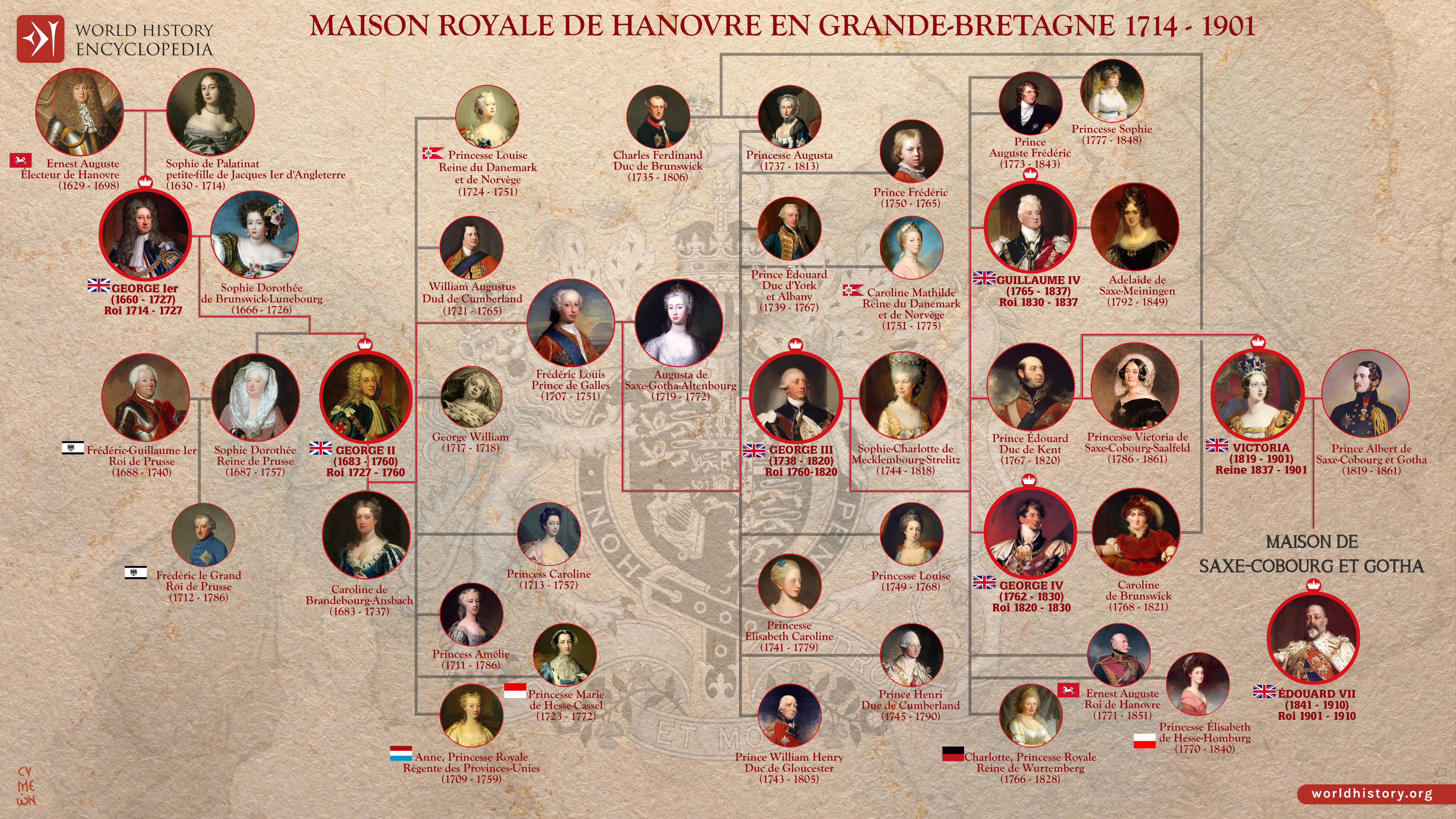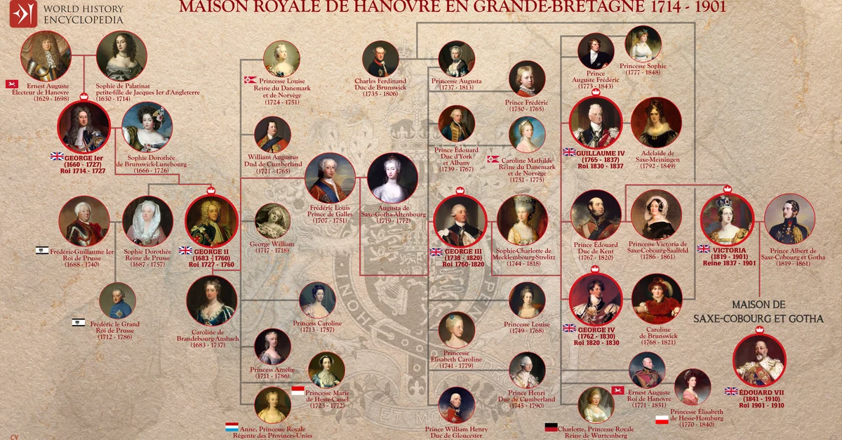 Au cours des XVIIIe et XIXe siècles, six monarques hanovriens présidèrent à des changements historiques majeurs, notamment la consolidation du gouvernement ministériel, la révolution industrielle, les guerres napoléoniennes, l'expansion de l'empire mondial et l'émergence de la politique parlementaire moderne. La dynastie s'acheva avec la reine Victoria (r. de 1837 à 1901), sous le règne de laquelle la Grande-Bretagne devint la puissance impériale dominante dans le monde. À sa mort en 1901, le trône passa à son fils Édouard VII, inaugurant ainsi la maison de Saxe-Cobourg et Gotha, rebaptisée plus tard maison de Windsor en 1917.