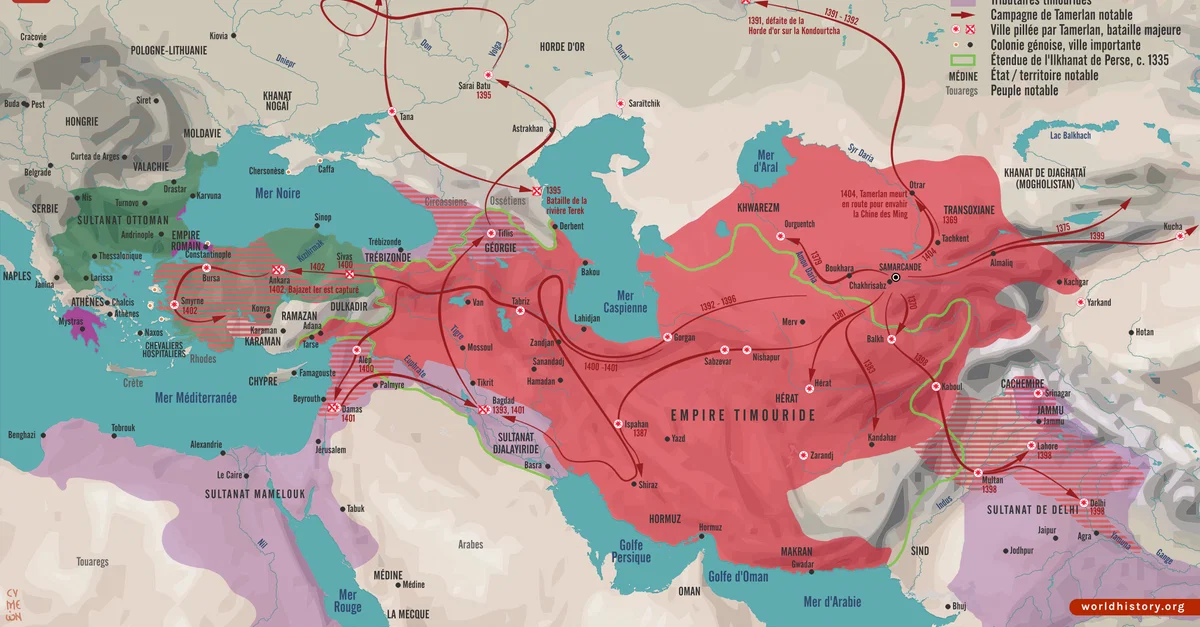 Cette carte illustre l'ascension et l'expansion de l'empire timouride (1370-1405) sous Tamerlan, un conquérant d'origine turco-mongole dont les campagnes militaires redessinèrent le paysage politique de l'Eurasie au XIVe siècle. Né en 1336 près de Kesh (aujourd'hui Shahrisabz, en Ouzbékistan), Tamerlan se hissa au pouvoir en Transoxiane, unifiant sous son règne les domaines fragmentés de Chagatai (alias Djaghataï). Combinant l'organisation militaire mongole et les traditions impériales perses, il lança une série de campagnes dévastatrices qui lui permirent de placer sous son contrôle une grande partie de l'Asie centrale, de la Perse, de la Mésopotamie et certaines régions de Russie, d'Inde et d'Anatolie. Ses victoires sur les Mamelouks, les Ottomans, le sultanat de Delhi et la Horde d'Or firent de lui le souverain le plus redouté de son époque, tandis que sa capitale, Samarcande, devint un brillant centre d'art et d'architecture islamiques.