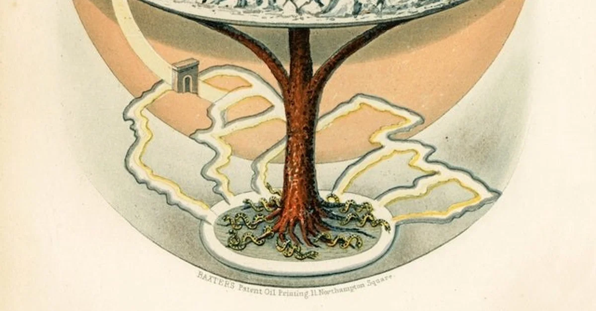 La cosmologia norrena divideva l’universo in nove regni. Il centro dell’universo era il grande albero del mondo Yggdrasil, e i nove regni si estendevano a partire dall’albero, oppure esistevano su livelli che si propagavano dalle sue radici verso il basso o, meno spesso, dai suoi lati.