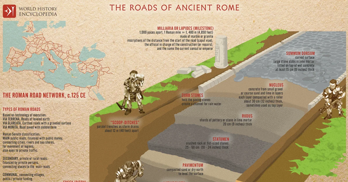 Le strade romane includevano ponti, gallerie, viadotti e molti altri accorgimenti architettonici e ingegneristici per creare una serie di opere mozzafiato ma estremamente pratiche che si estendevano dal Portogallo a Costantinopoli. La rete di strade pubbliche romane copriva oltre 120.000 km e favoriva la libera circolazione di eserciti, persone e merci attraverso l'impero. Le strade erano anche un indicatore molto visibile del potere di Roma e contribuivano indirettamente a unificare quello che era un vasto crogiolo di culture, razze e istituzioni.